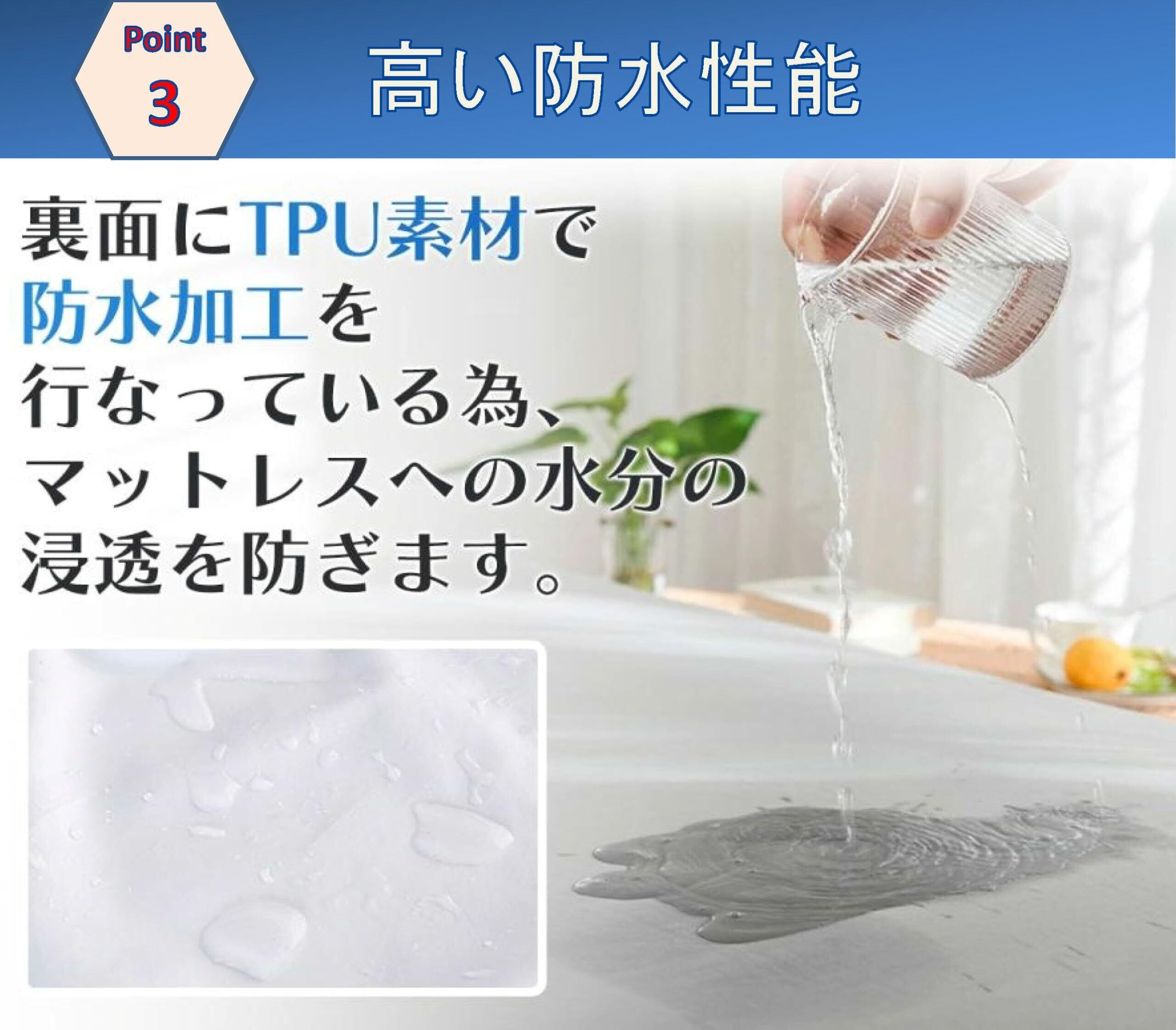 2【優れた防水性能で清潔さをキープ!】防水加工により、液体が漏れ出す心配がなく、マットレスやベッドをしっかりと守ります。抗菌・防臭・防ダニ機能を搭載しているため、常に清潔な状態を保ちます。