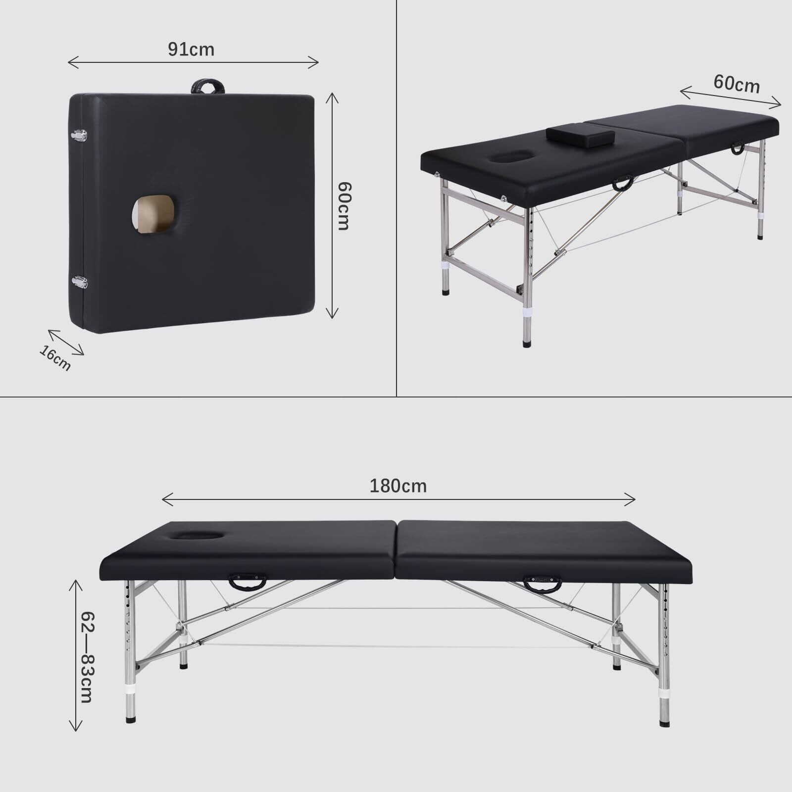 マッサージベッド 折りたたみ 軽量 マッサージ折りたたみベッド 施術ベッド マッサージ台 診察台 高さ調節 組立て不要 長さ180×幅60×高さ62~83cm (鋼製 ブラック)