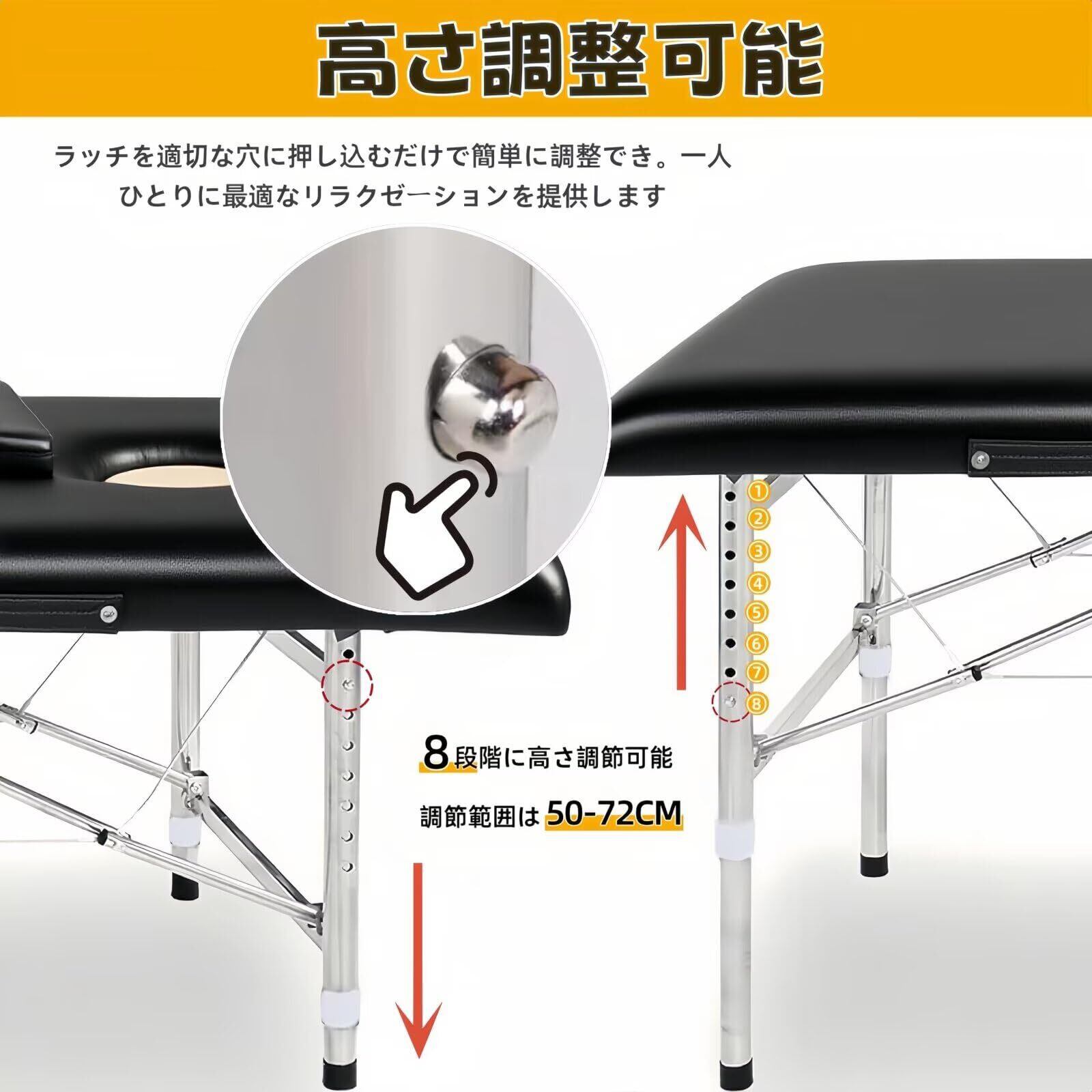 【8段階に高さ調節可能】8段階の高さ調節が可能な施術ベッドは、調節範囲は50-72CMで、さまざまな身長のマッサージ師が使用するのに便利でき。ラッチを適切な穴に押し込むだけで簡単に調整でき。一人ひとりに最適なリラクゼーションを提供します。ご注意:サイズ測定では1-3cmの誤差があります。予めご了承ください。