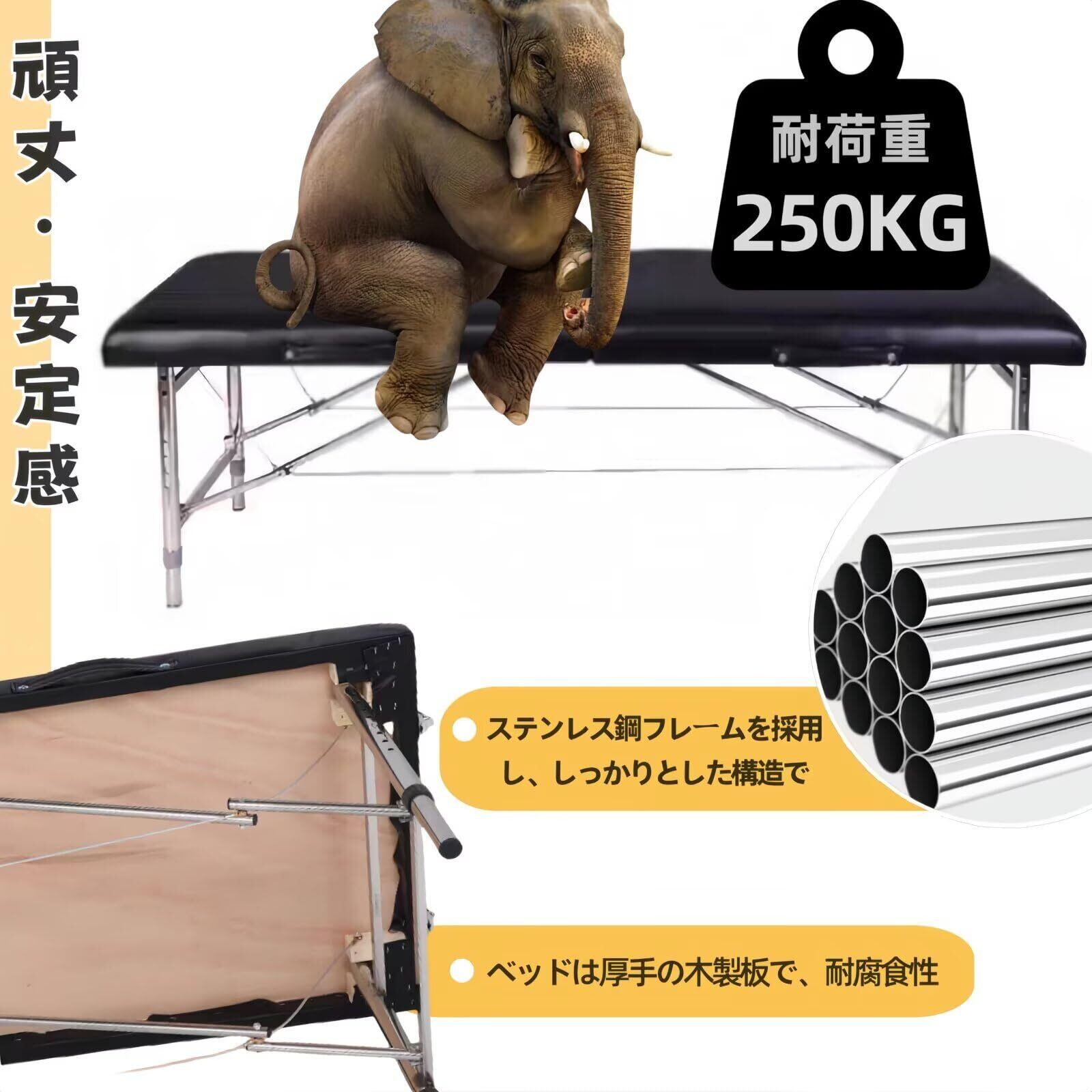2【高耐久・軽量設計で安心!】高品質のフレームを使用し、最大耐荷重は250kg。しかも軽量で持ち運びも楽々!施術を受ける方も安心してご利用いただける設計です。