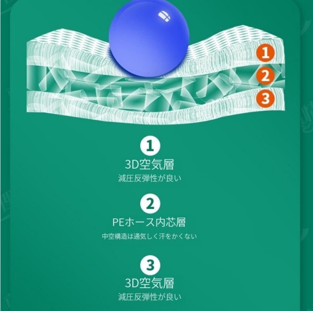 2【通気性抜群の設計!】このマットレスは、通気性に優れた素材を使用しており、湿気がこもらず快適な状態を保ちます。長時間の使用でも、心地よい環境を維持し、寝汗による不快感を軽減しますので、安心してお使い頂けます。