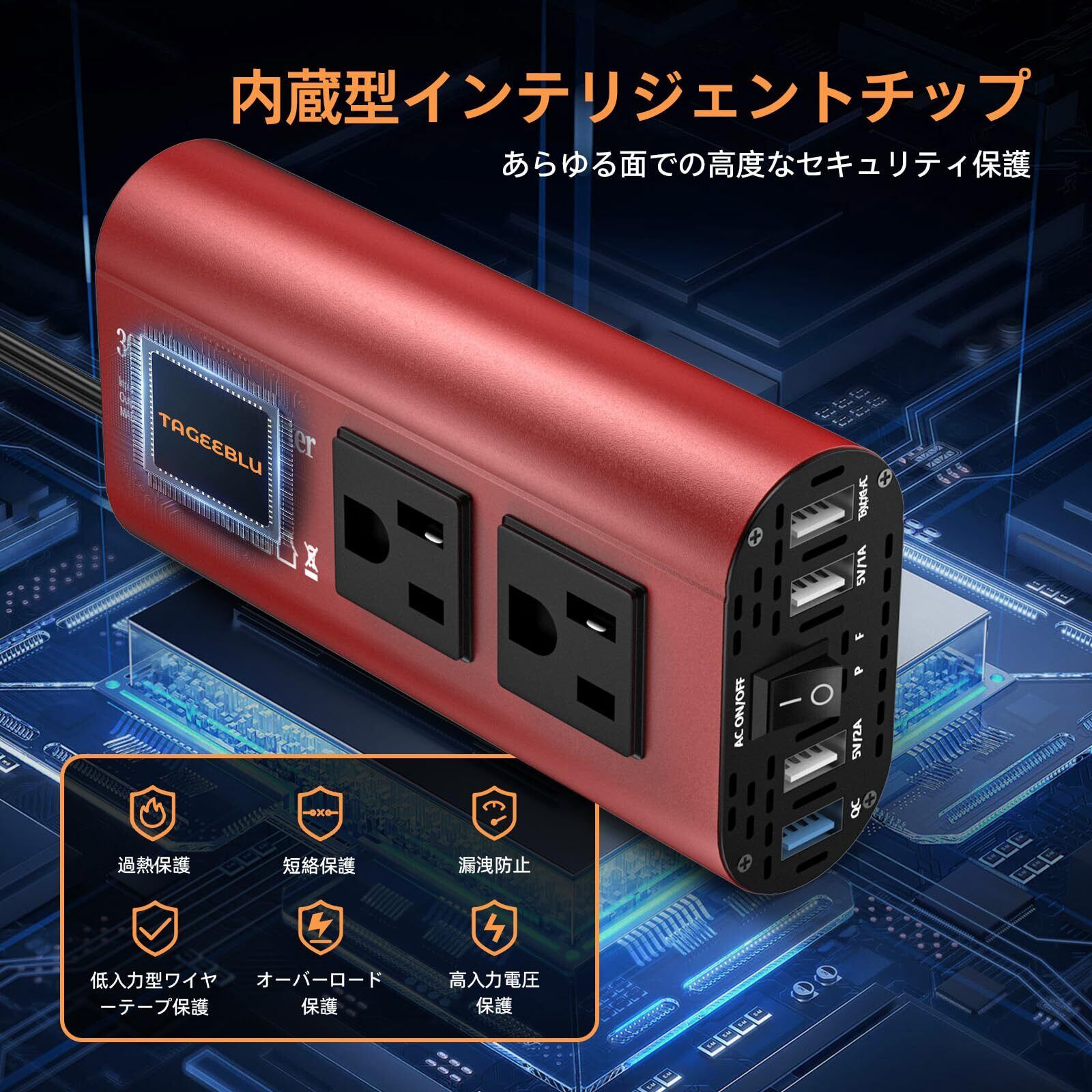 300W インバーター 12v 100v, 車 インバーター, シガーソケット コンセント DC12VをAC100Vに変換 USB 4 ポート搭載 12V車専用 カーインバーター