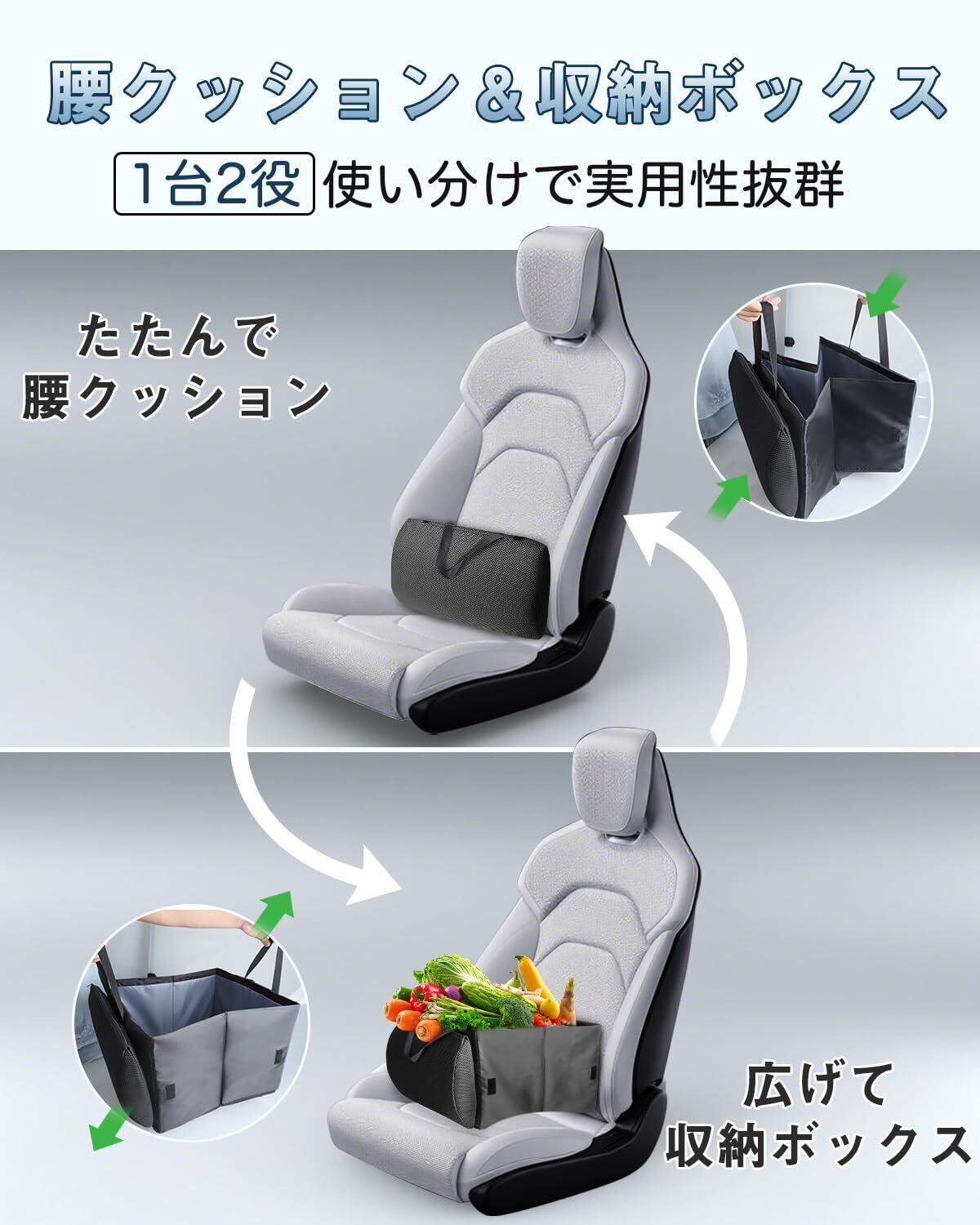 【2WAY仕様 シートボックス 腰 クッション】たたむとクッション、広げると収納ボックスになる、1品2役の便利なカー用品です。収納ボックスとして、助手席に荷物置きにして散らかりがちな車内をスマートに整える便利です。クッションとして使用すれば、運転中の背中とシートの隙間を埋め、腰を優しくサポートして長時間の運転をより快適になります。