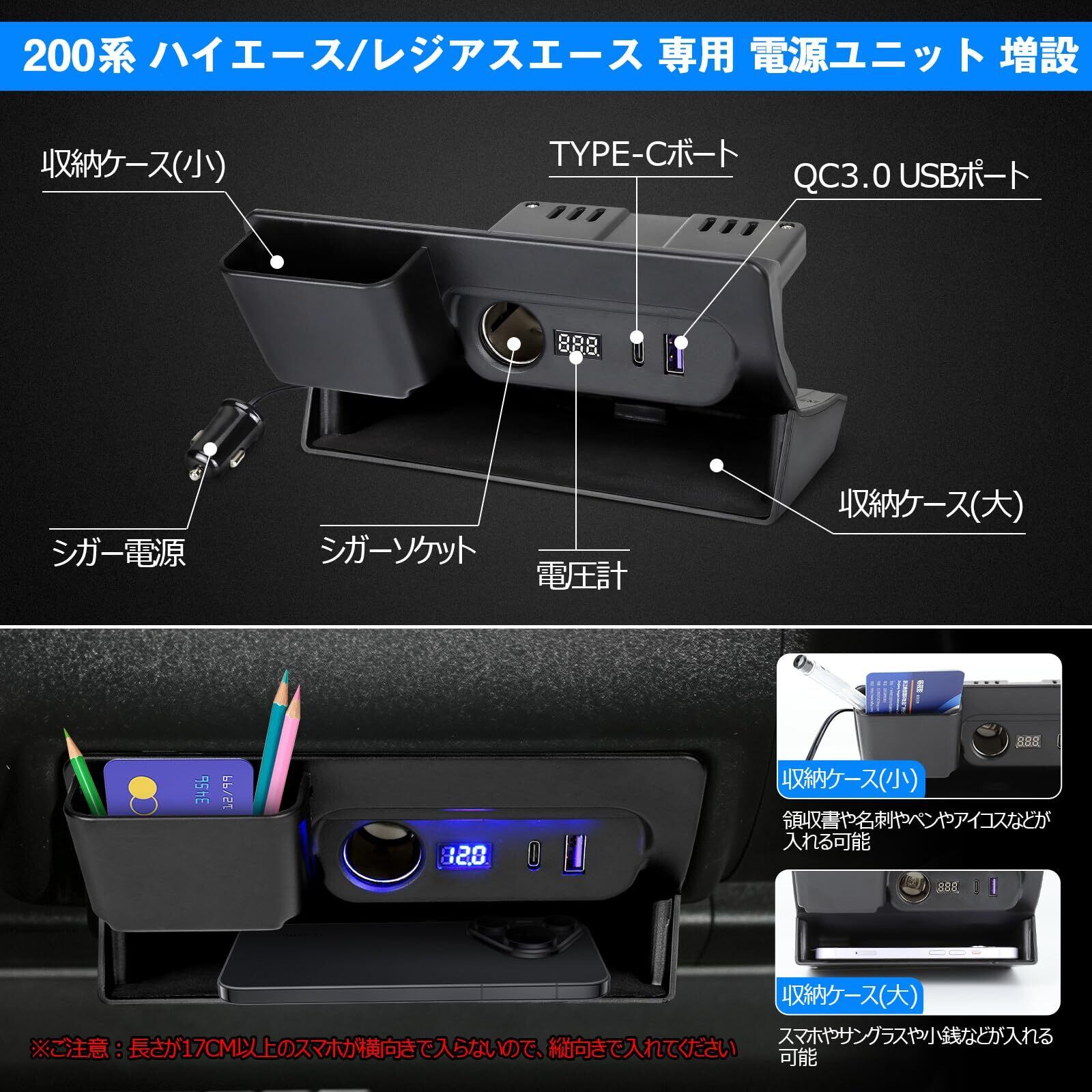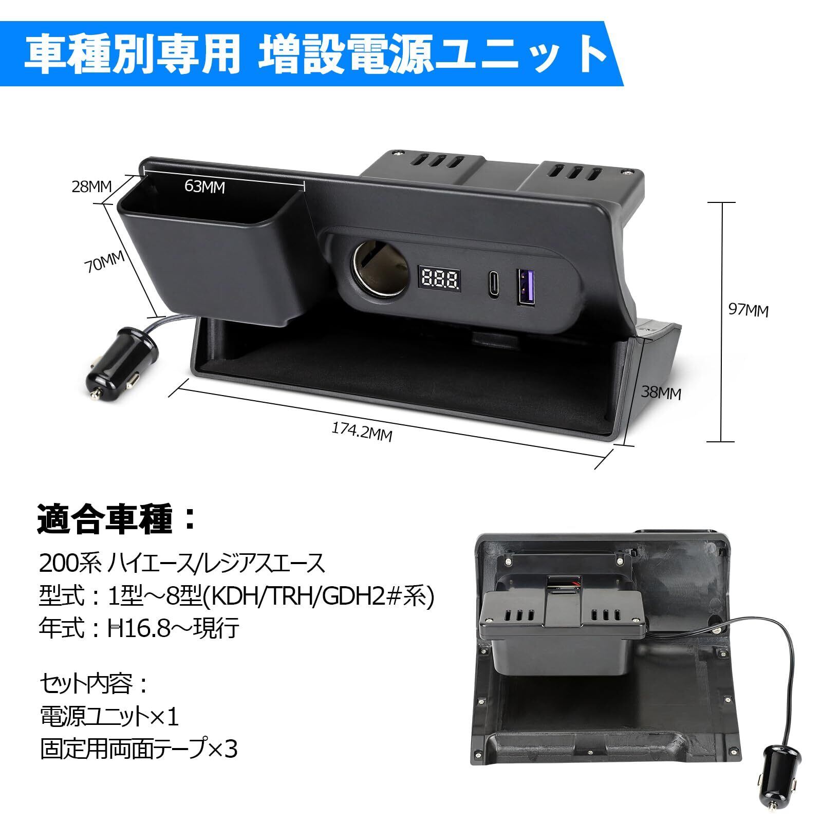 ハイエース 200系 専用増設電源ユニット、適合車種:200系 ハイエース/レジアスエース、型式:1型~8型(KDH/TRH/GDH2#系)、年式:H16.8~現行。製品仕様:QC3.0 USB ポート×1、Type-C PD ポート×1、シガーソケット×1、収納ケース(1大1小)×2、電圧計付き、LEDフットライト付き。セット内容:電源ユニット本体×1、固定用両面テープ×3、ウェットティッシュ×2、1年保 証付き。取付位置:センターコンソールの純正灰皿と交換。