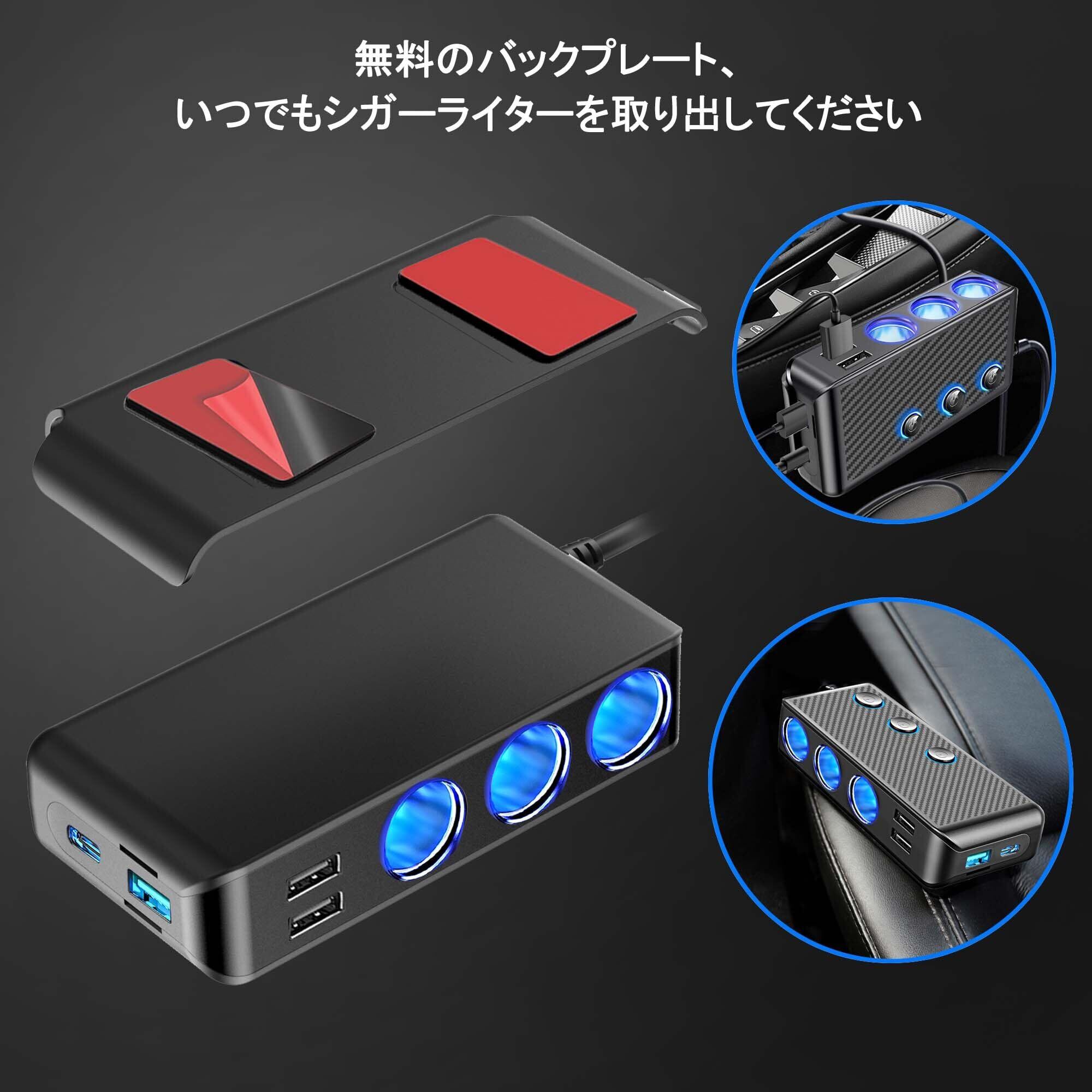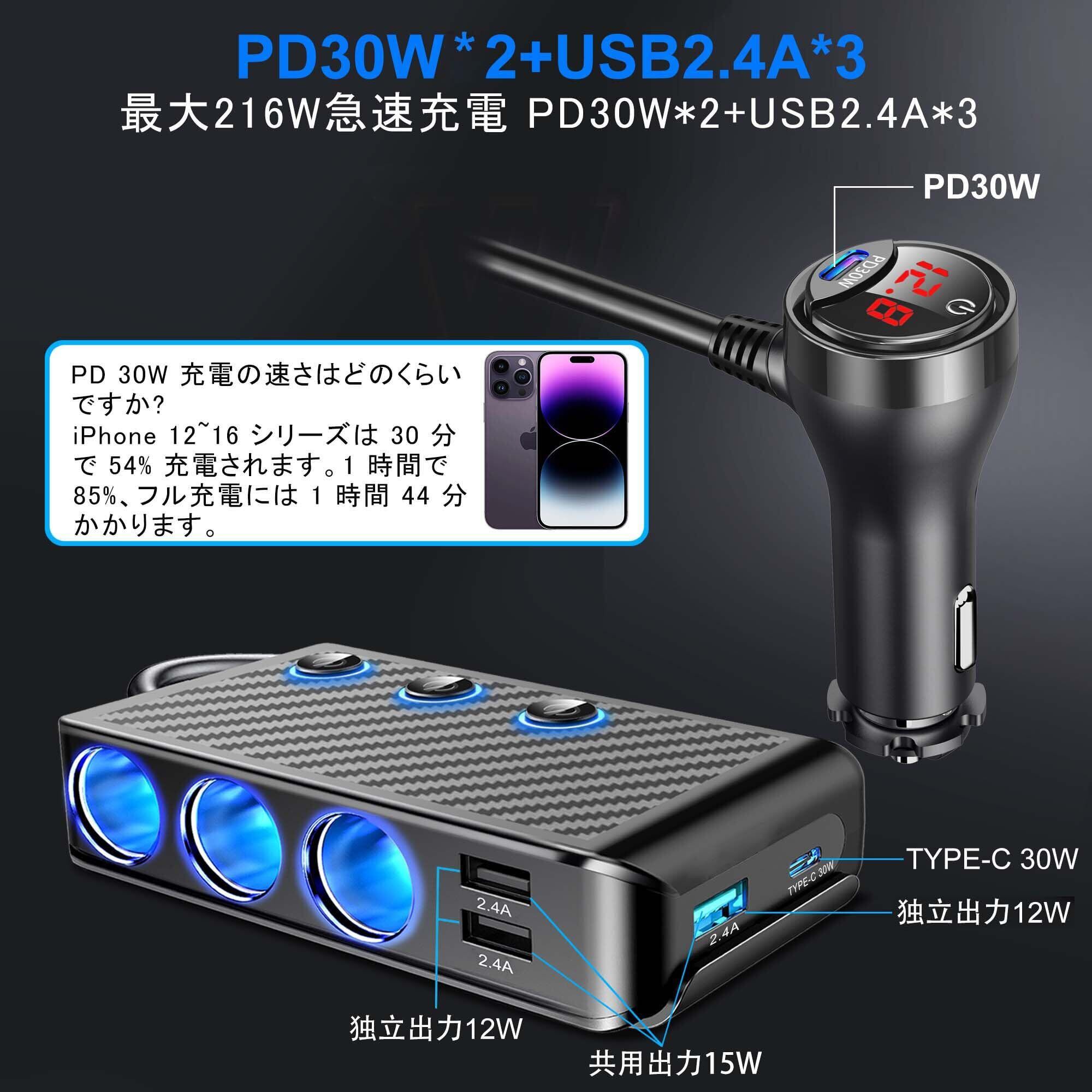 シガーソケット 216W 3連 USB車載充電器 増設 ソケット Quick Charge 3.0 搭載USB Type-C急速充電増設カーチャージャー 電源ソケット 分配器 車載充電器能搭載 12V/24V車対応 カーチャージャー