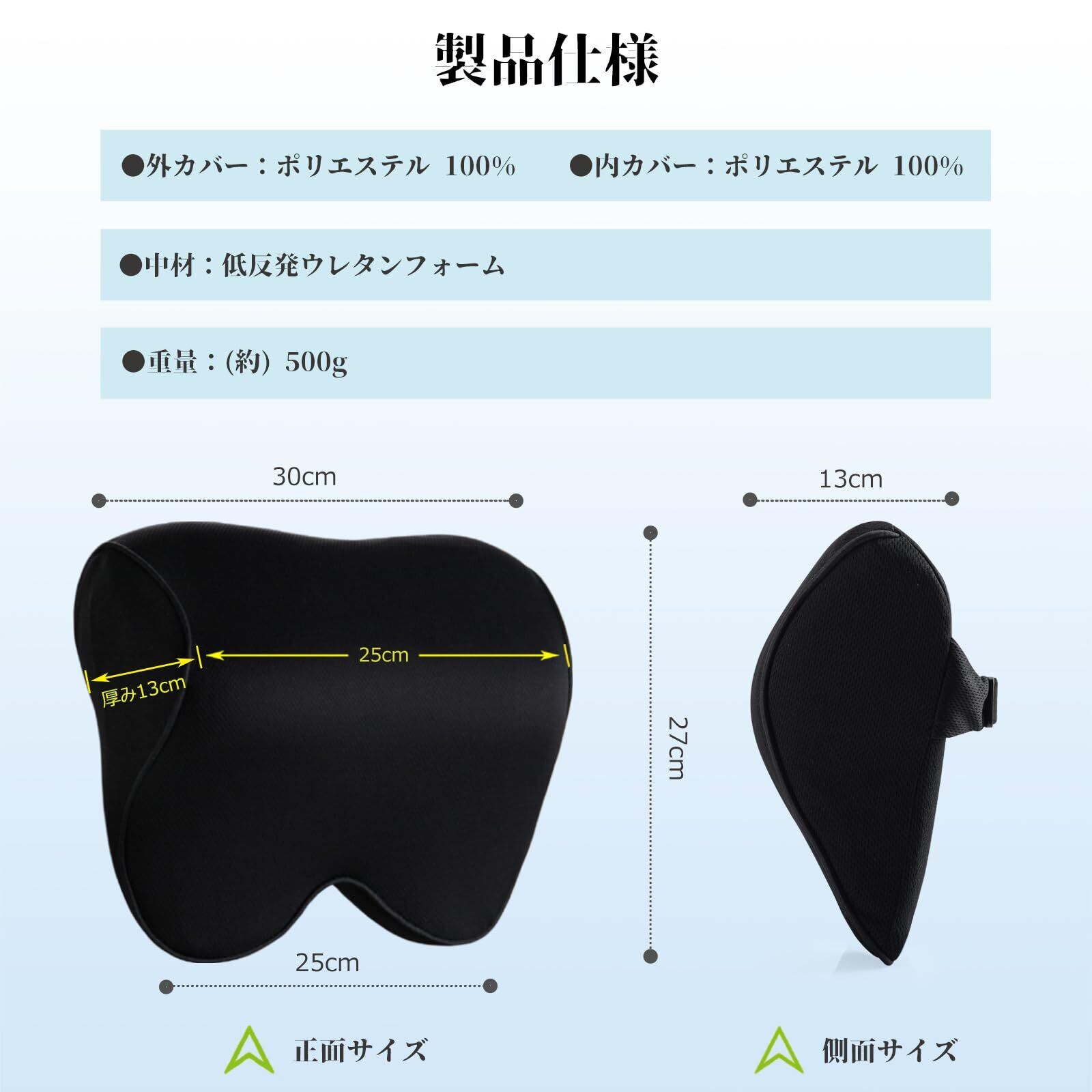 サイズ:約高27×幅30×厚さ13cm 外カバー:ポリエステル100% 中材:低反発ウレタンフォーム 内カバー:ポリエステル100% 重量:380g