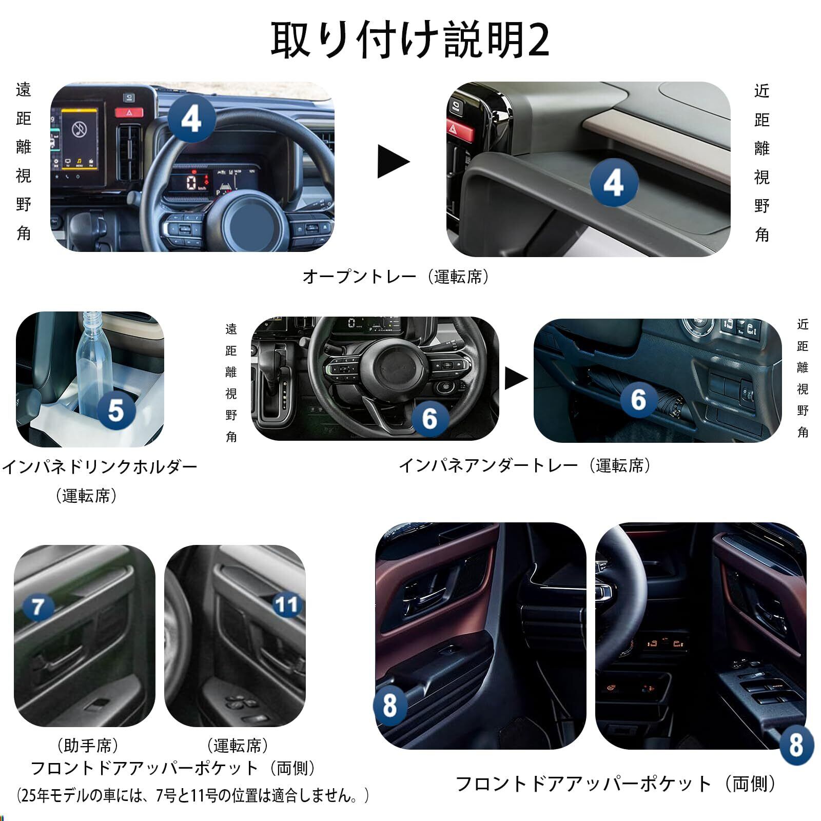 【車種専用設計】適応車種:スズキ スペーシア/スペーシアカスタム 適応型式: 3代目 MK54S/MK94S(2023.11~2024)※25年式の車種は、本商品のフロントドアアッパーポケット位置(最上部の7番、11番位置)には対応しておりません。それ以外の位置はご利用いただけますので、ご注意の上、必要に応じてご注文ください。