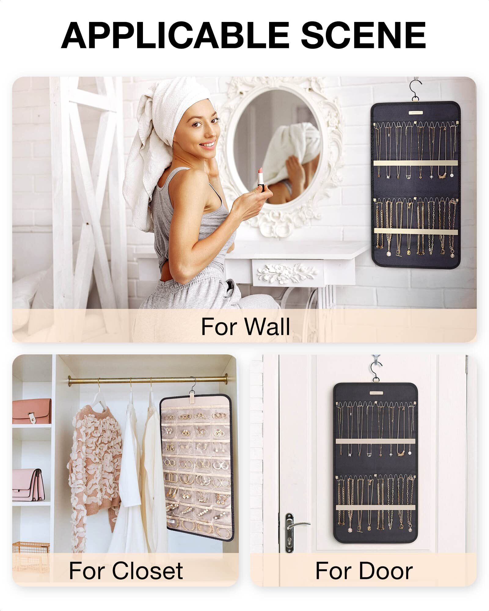 【大容量】両面吊り下げ式ジュエリーオーガナイザーは、ジュエリーを収納するための十分なスペースを提供します。32個の透明ポケットに指輪、イヤリング、ブレスレット、時計、ヘアピン、その他のジュエリーを収納可能で、反対側には最大28個のネックレスを収納できます。