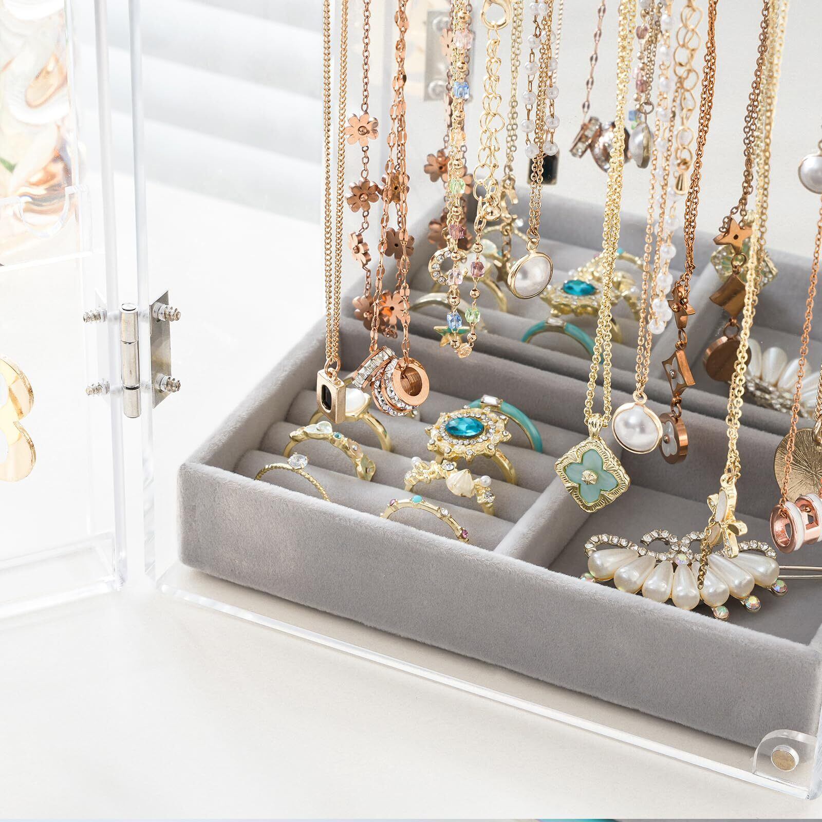 4【高級感溢れる素材と仕上げ!】ベルベットトレイが付いており、ジュエリーを優しく守ります。アクリル素材は防塵性にも優れており、いつでも清潔感を維持することができます。大切なジュエリーを長く美しく保つための最適な選択です。