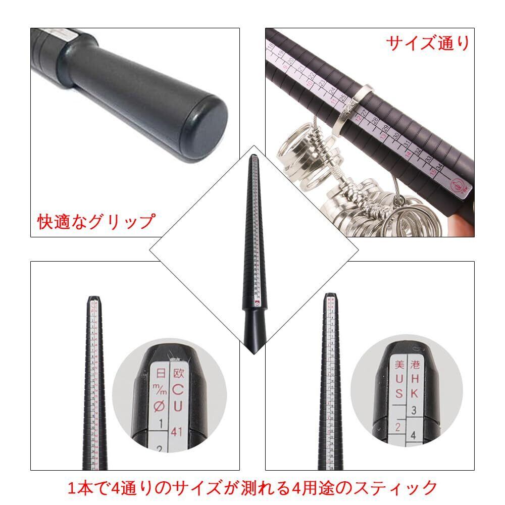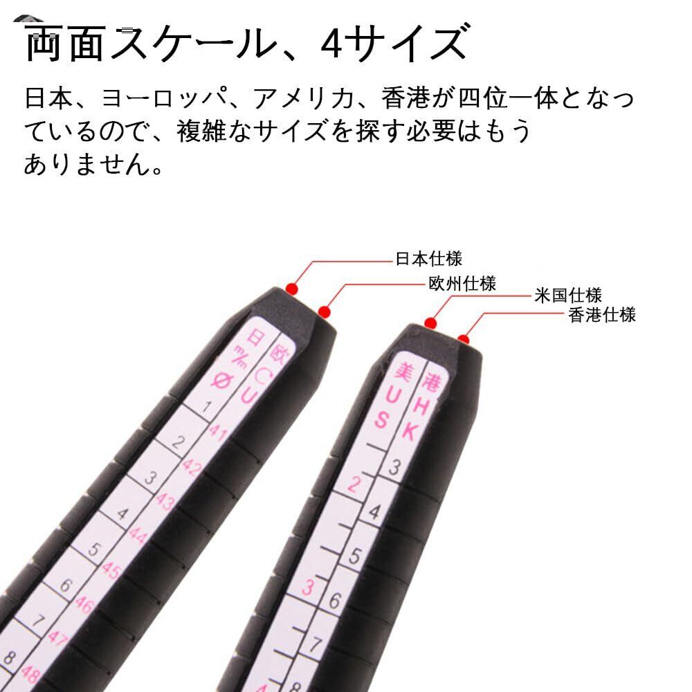 - 特徴:再利用可能な指サイズ測定ツール(サイズ日本1-34号、米国2-15号、欧州41-76号、香港3-34号対応、溝付き)