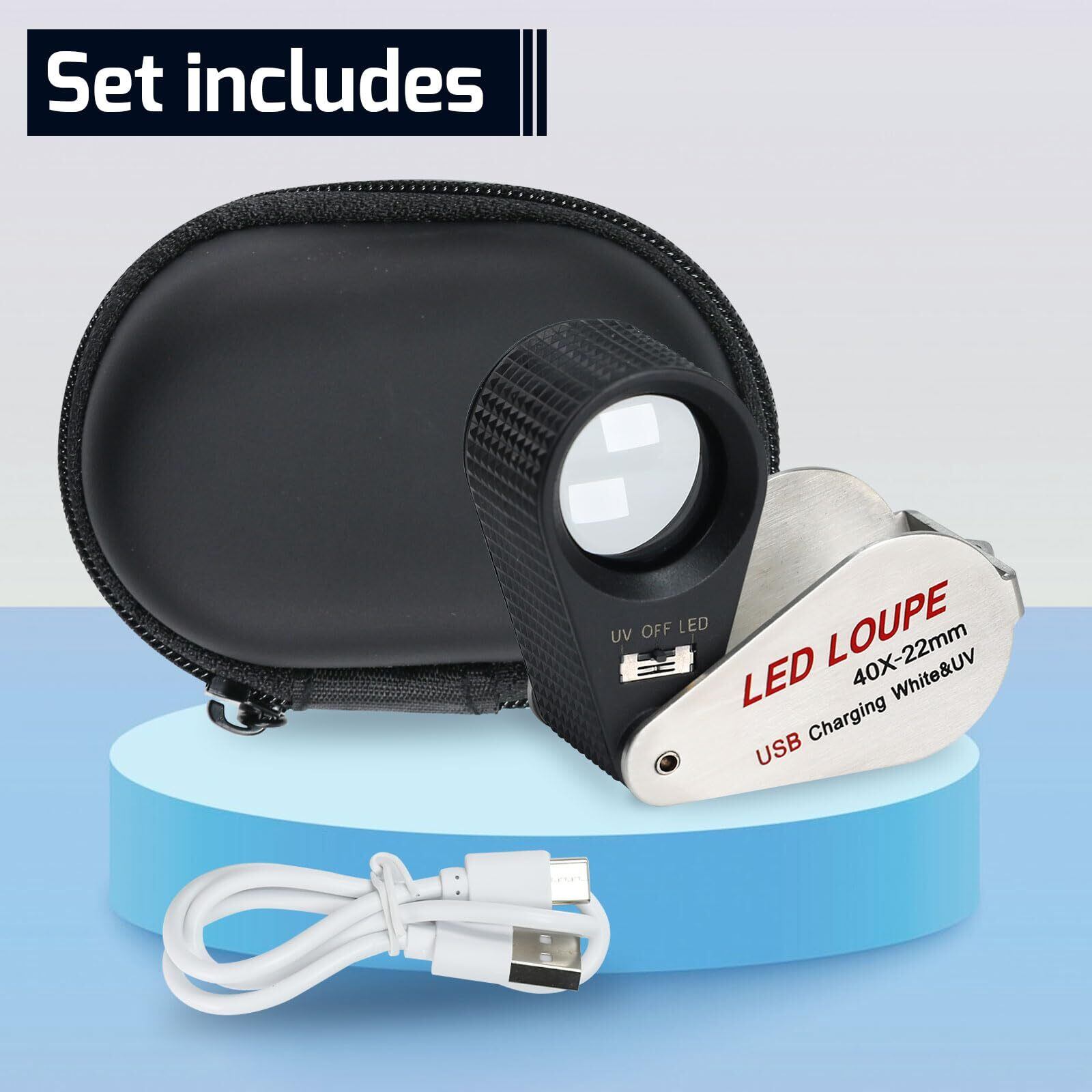 【新着商品】イルミネーションジュエラーズルーペ拡大鏡40倍、充電式ジュエラーズルーペ折りたたみ式ジュエリー拡大鏡LEDルーペ、6個のLED&UVライト付き、宝石、ジュエリー、コイン、切手など用