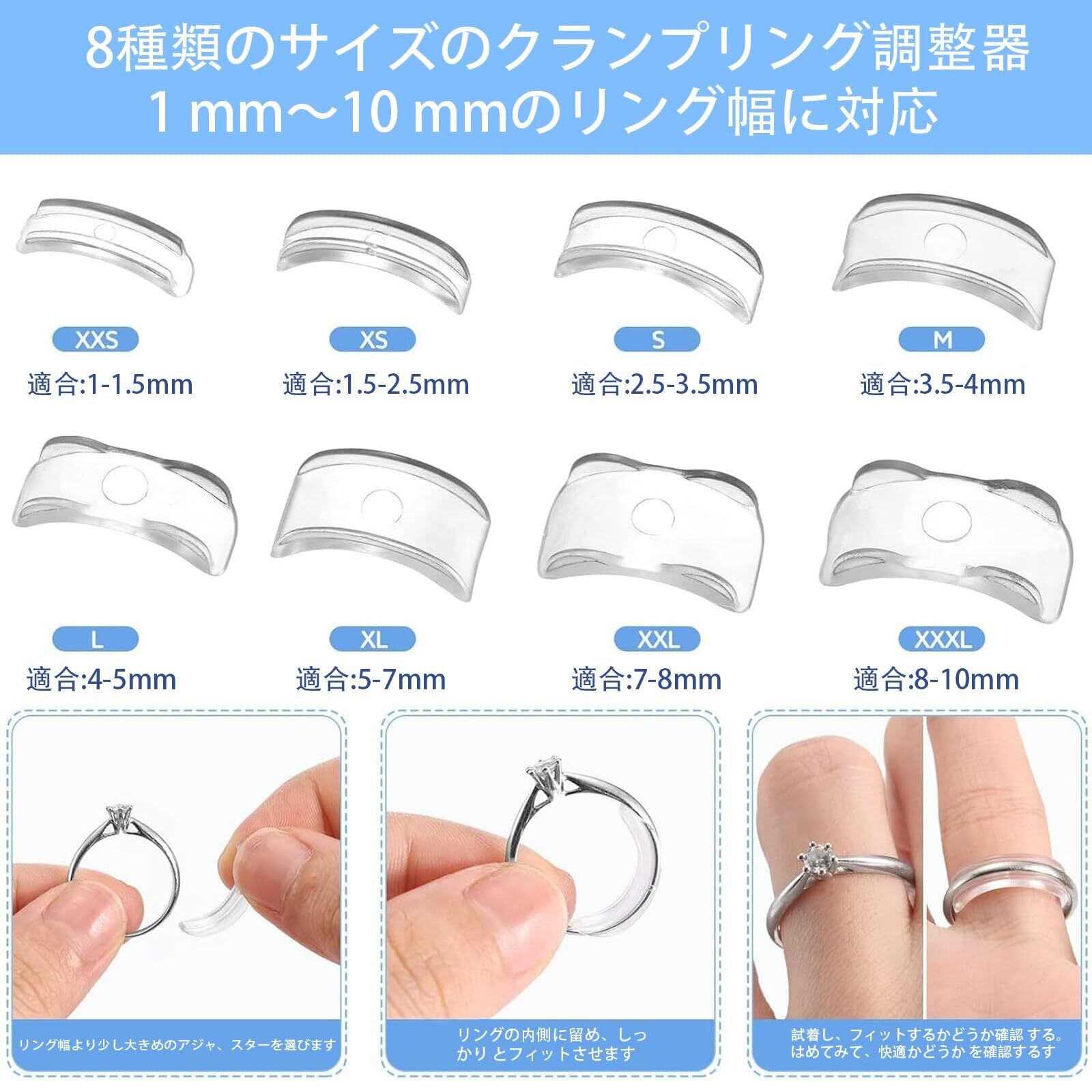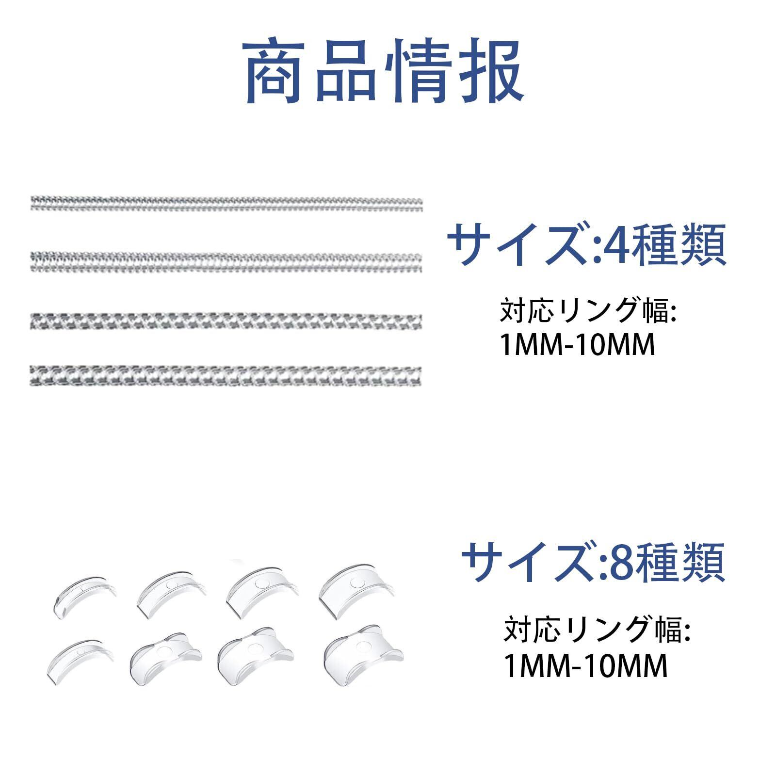 【セット内容】指輪調節具のサイズ:1.5mmXXS*1、2.5mmXS*1、3.5mmS*1、4mmM*1、5mmL*1、7mmXL*1、8mmXXL*1、10mmXXXL*1。指輪調整用TPUスプリングワイヤ×4。幅は1mm~10mmの指輪に対応、指輪にフィットするサイズをご自由に選択できます。