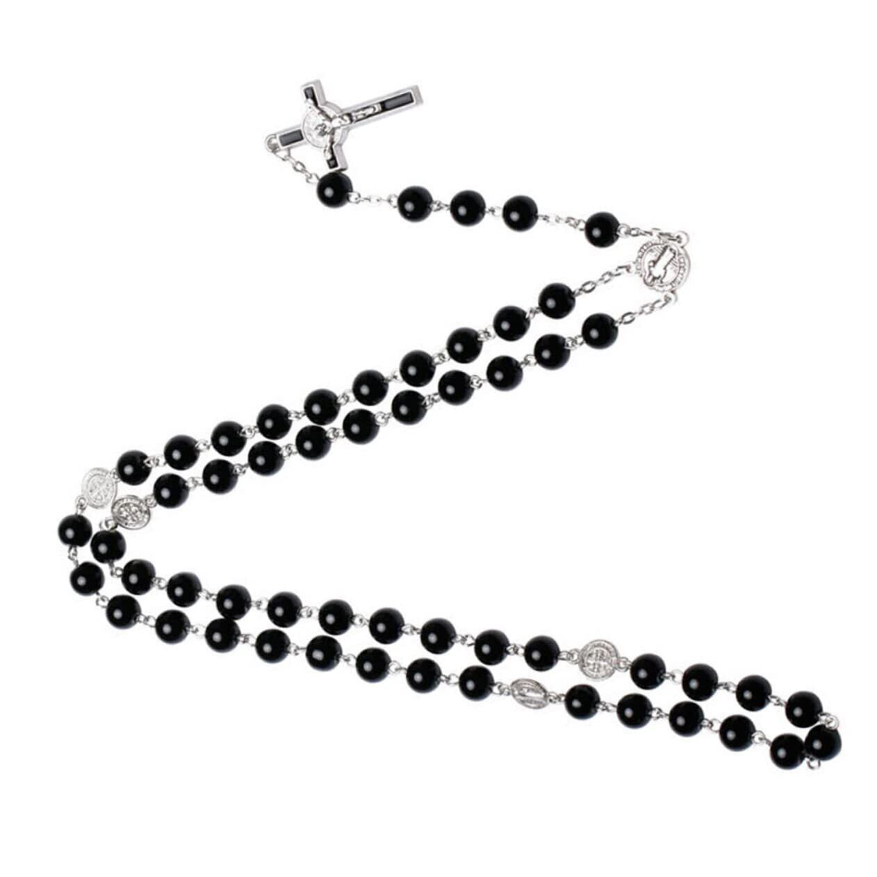 【2022最新】黒色ガラスパール念珠ネックレス ジーザスクロスペンダント カト