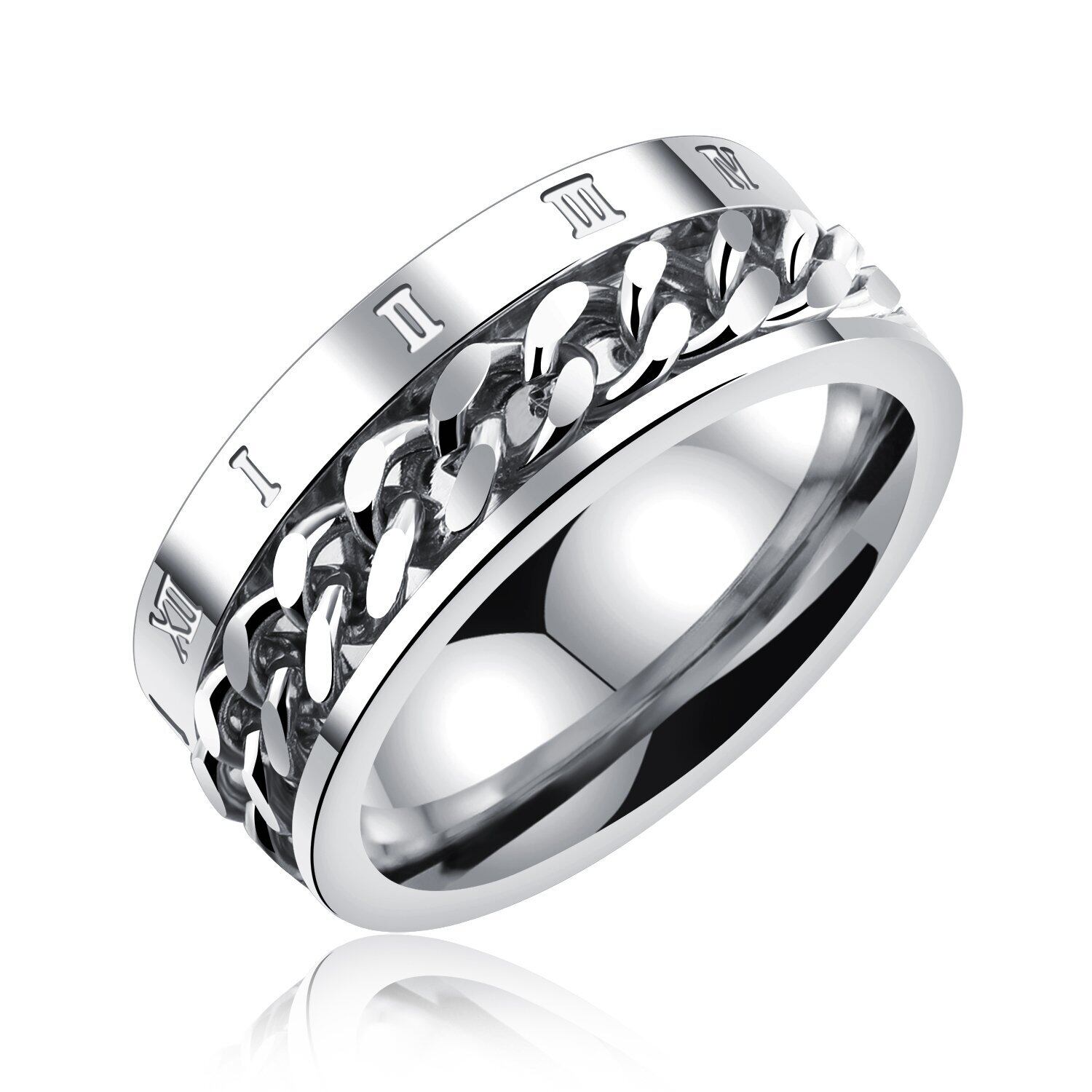 1【洗練されたシンプルデザイン!】この「Rockyu メンズ指輪」は、シンプルでありながらローマ数字の刻印が特徴のスタイリッシュなリングです。回転するチェーンデザインは、指元でさりげなく存在感を放ちます。ビジネスシーンからカジュアルな場面まで、幅広く活躍する一品です!