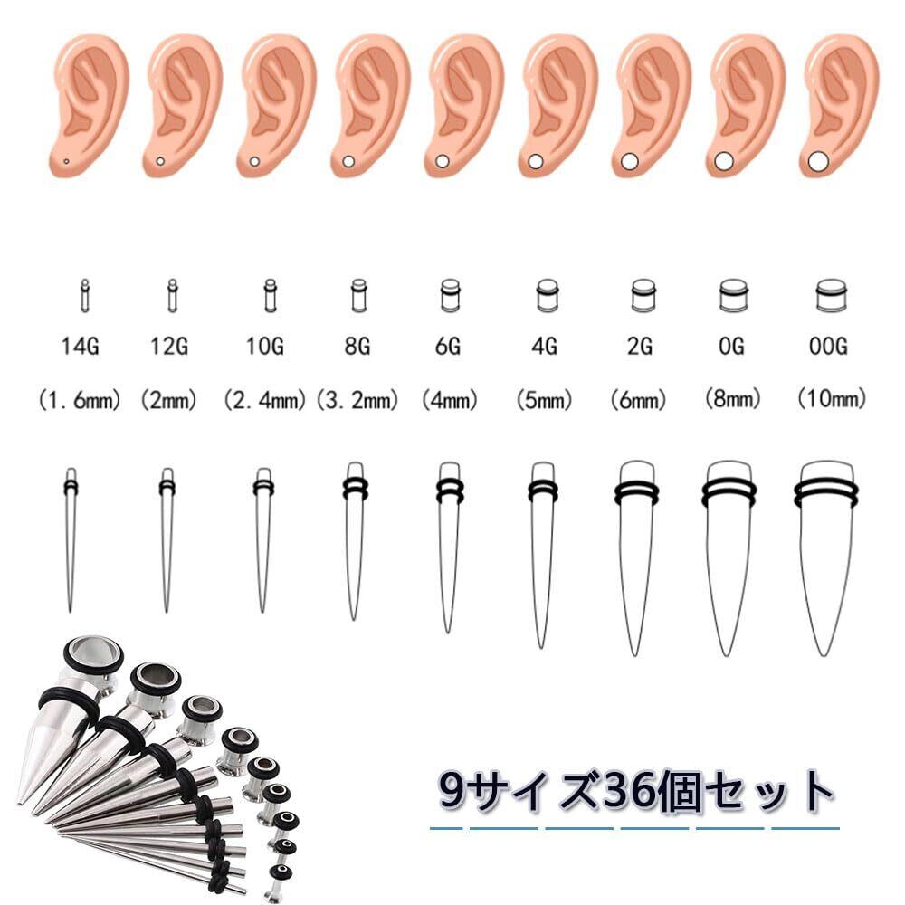 【パッケージ内容】個数:18ペア/36点;9サイズセット:9サイズセット:00G-10mm、0G-8mm、2G-6mm、4G-5mm、6G-4mm、8G-3.2mm、10G-2.4mm、12G-2mm、14G-1.6mm。。