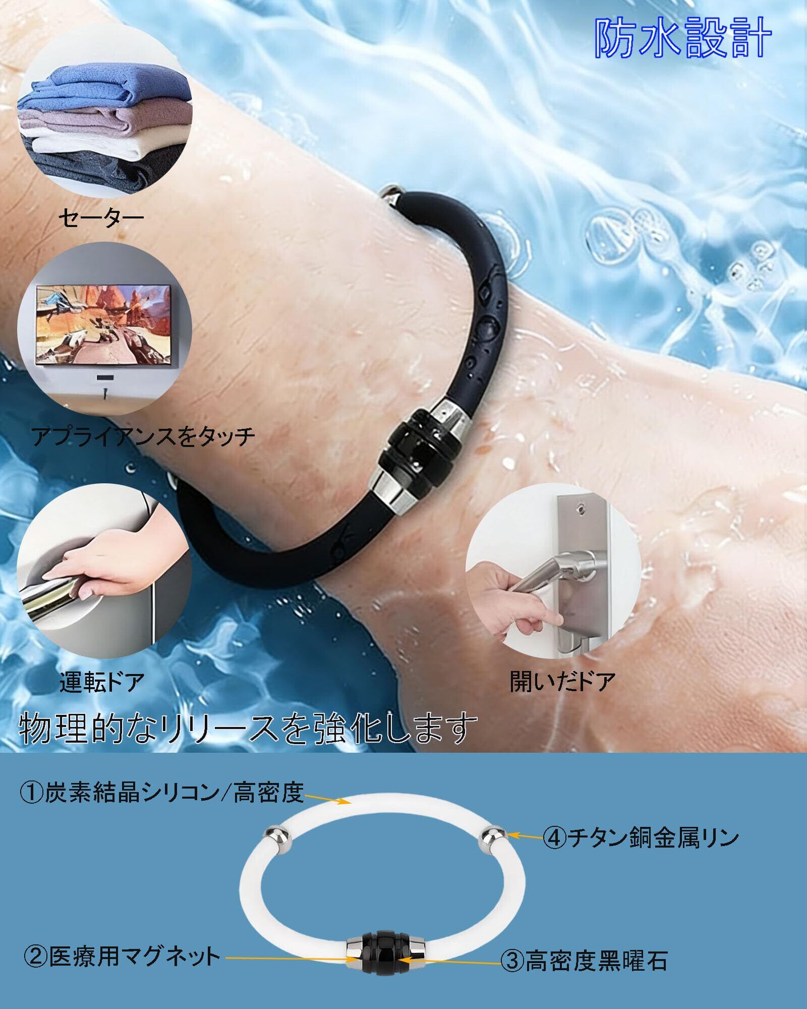 【優れた耐久性・防水機能】静電気除去バンドはは耐久性に優れたシリコン、チタンスチール、磁石を組み合わせて作られています。変色・錆びにくく、優れた撥水性で手洗いや入浴時、雨天時もにも着用可能で、効果を持続させることができます。