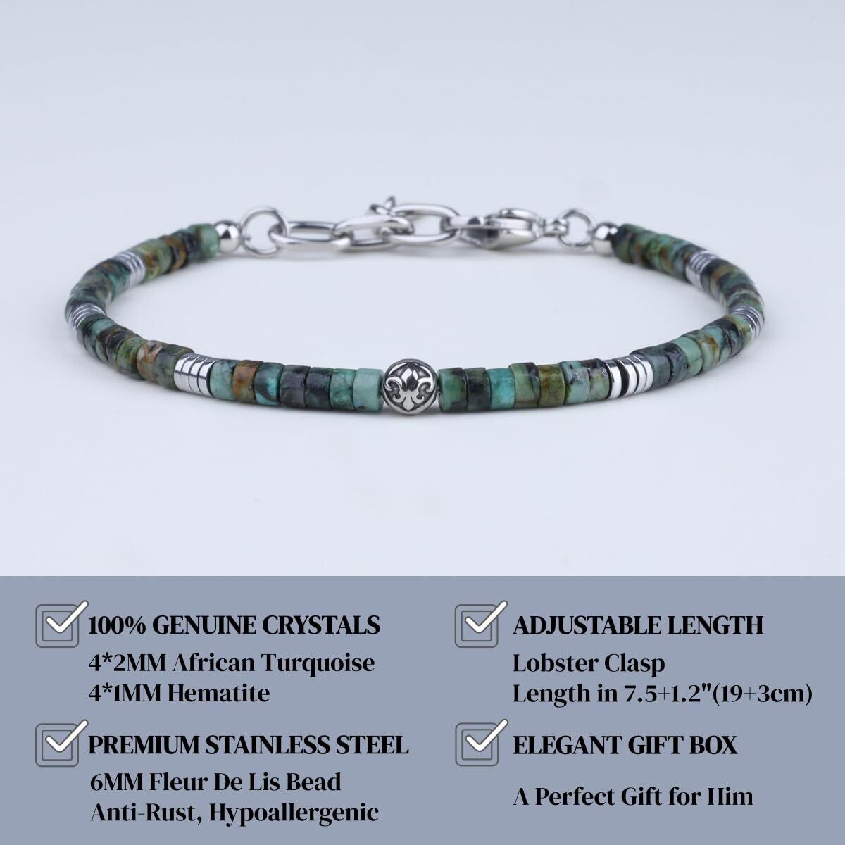 アフリカンターコイズブレスレットの中央には、象徴的なユリの紋章「フルール・ド・リス」をかたどった6mmステンレスビーズを配置。フルール・ド・リスは古くから品位や信念、誠実さの象徴として用いられてきたモチーフで、デザインに意味と奥行きを与えています