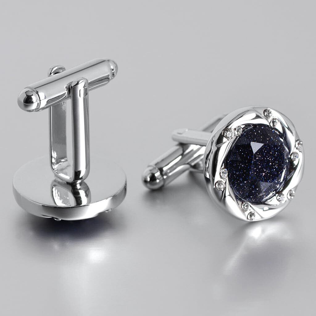 【煌めくブルーのカフスボタン】深い夜空を思わせるブルーサンドストーンが印象的なカフスボタン。ラウンドとスクエアの2タイプがあり、フォーマルシーンに上品な個性を演出します。石のきらめきが袖元に高級感と洗練された雰囲気を添えます。