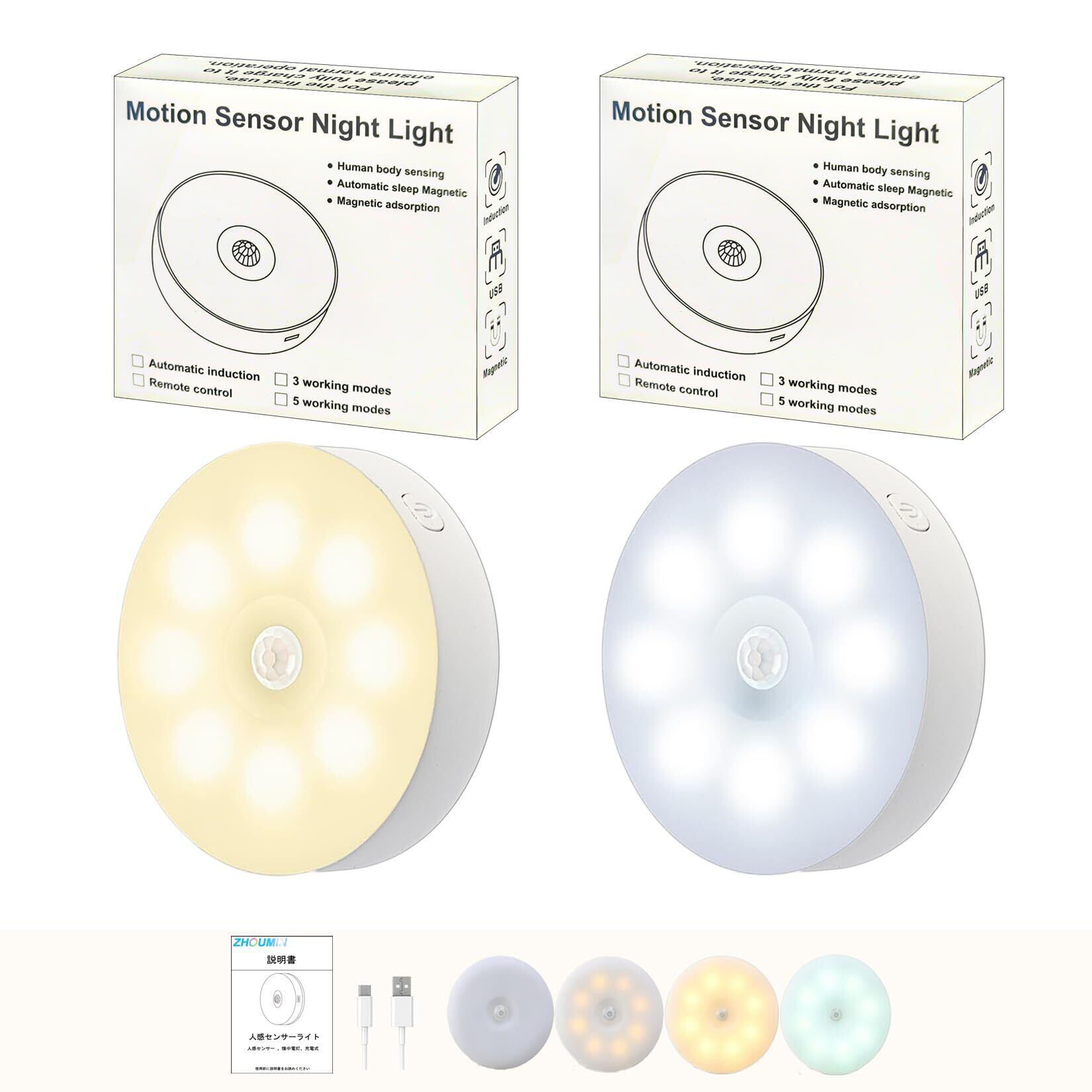 ZHOUMIN センサーライト 室内 充電式 【夜は家で活動するのが便利で、たんすを開けて物を探しても、水を飲んだり授乳したりしても】2色(電球色+昼光色)無段階調光 人感センサーライト 懐中電灯 間接照明 足元灯 常夜灯 浴室/寝室/階段/押入れ (2個セット-日本語説明書付き)