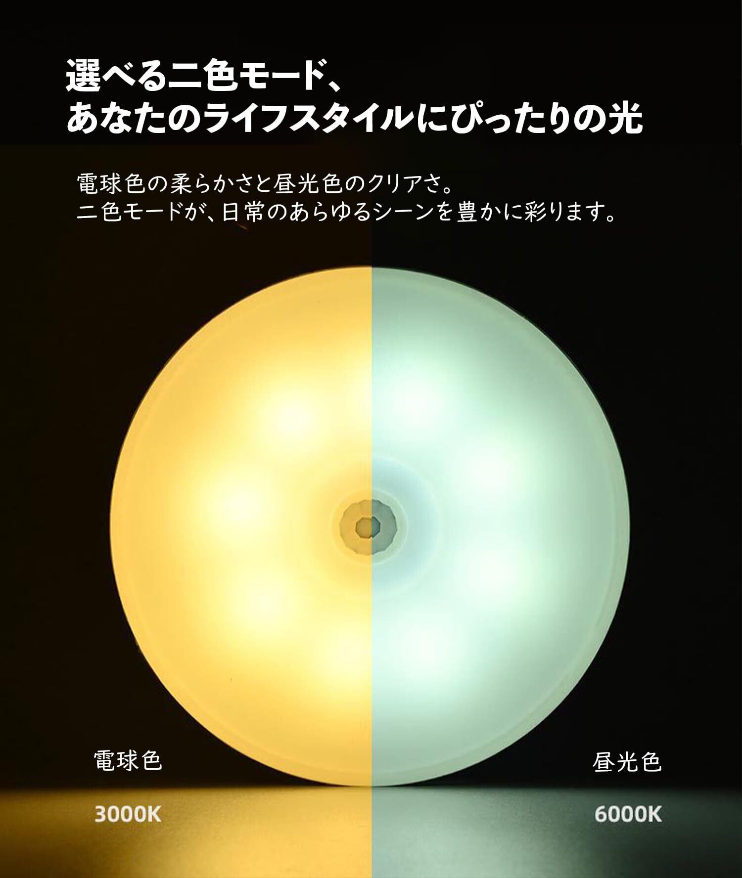 1【便利で多彩な充電式センサーライト!】「ZHOUMIN センサーライト」は、夜の家の中での活動を一層便利にするアイテムです。電球色と昼光色の2色が楽しめ、無段階で調光が可能なこのライトは、たんすを開けての物探しや、水を飲んだり授乳をしたりする瞬間に最適です。人体感知センサーが搭載されているので、スムーズに照明が点灯します。
