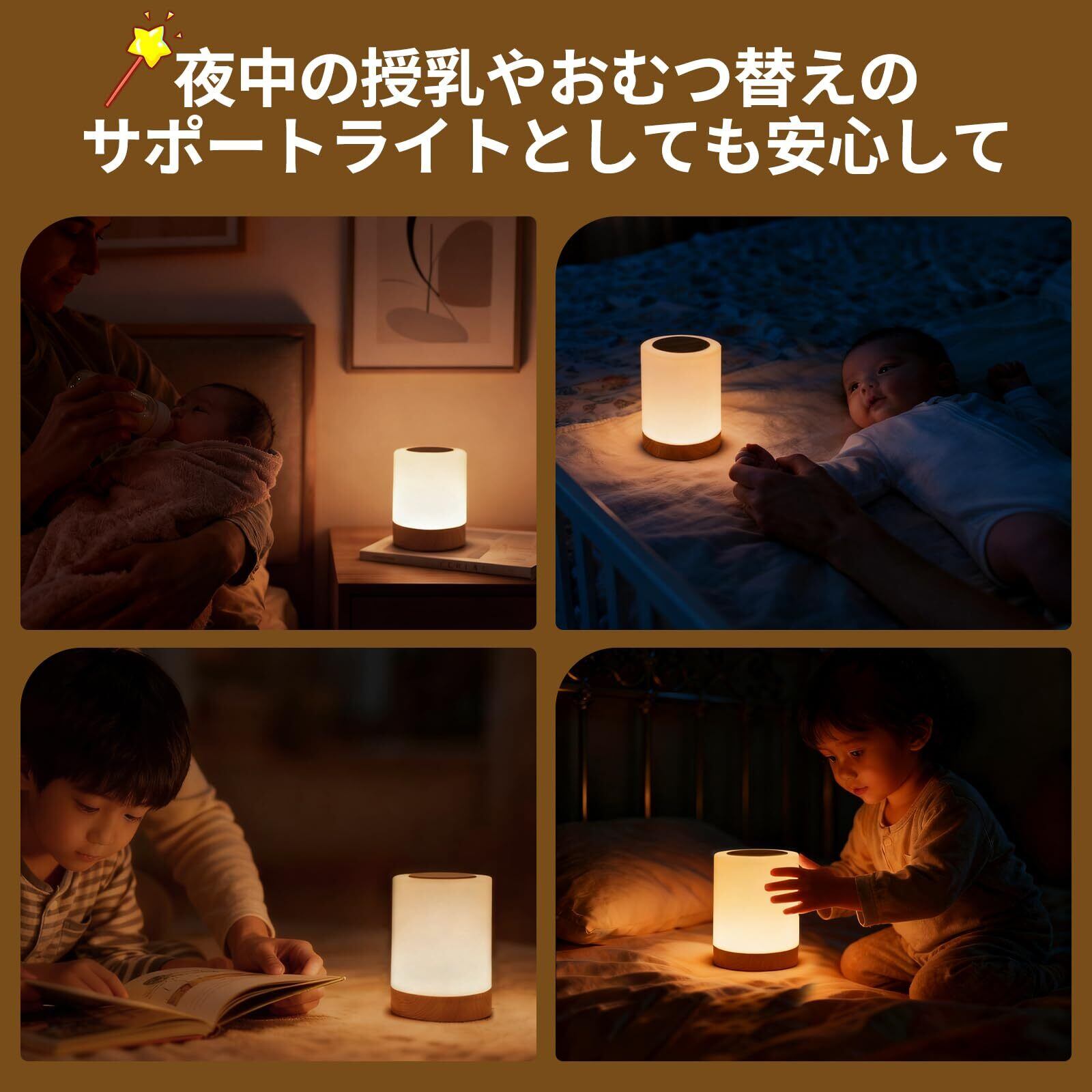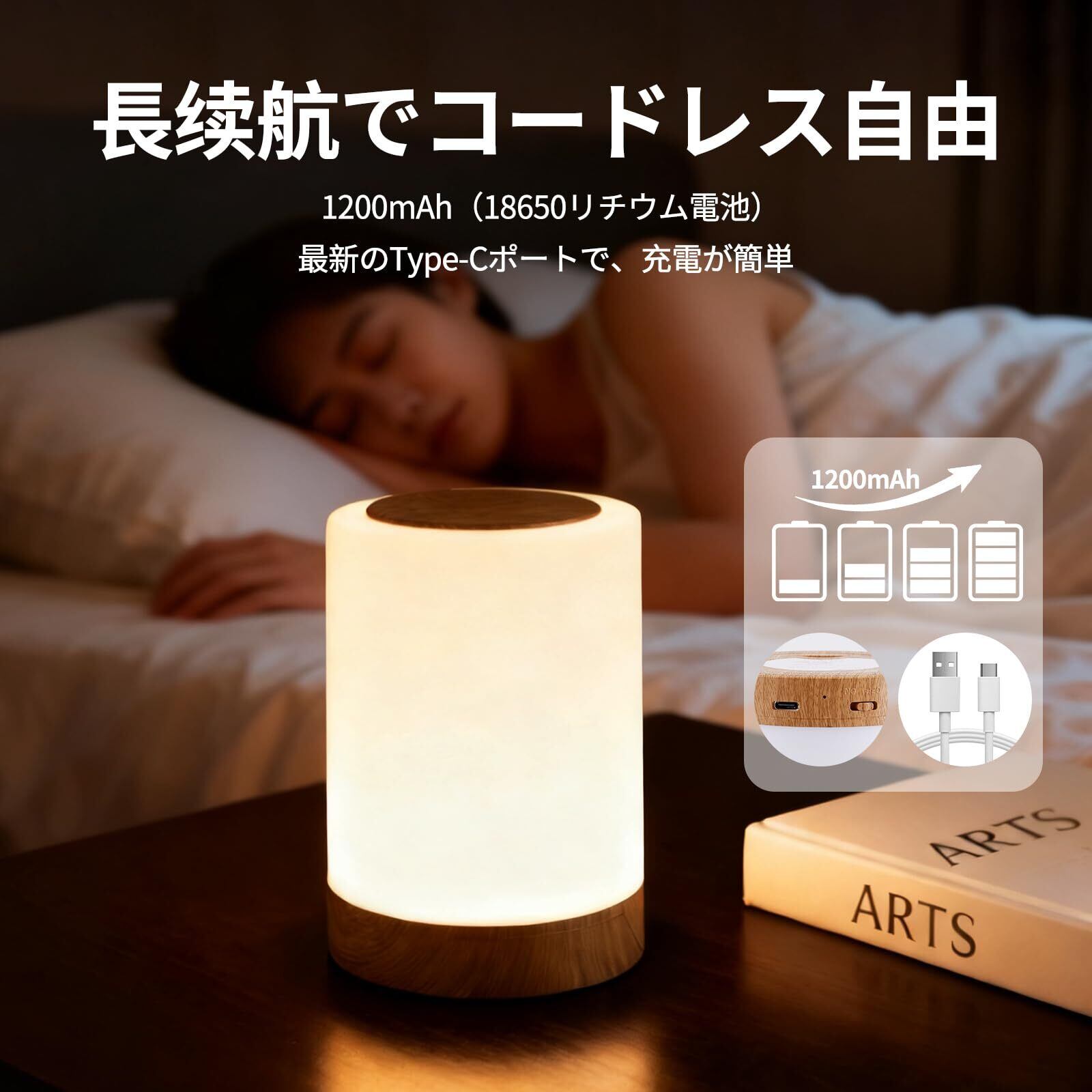 ベッドライト 授乳ライト ベッドサイドランプ ナイトライト 調光調色 タッチライト RGB 間接照明 目に優しい Type-C充電式 1200mAh 寝室 枕元 常夜灯 一人暮らし 防災 ギフト (木目調)
