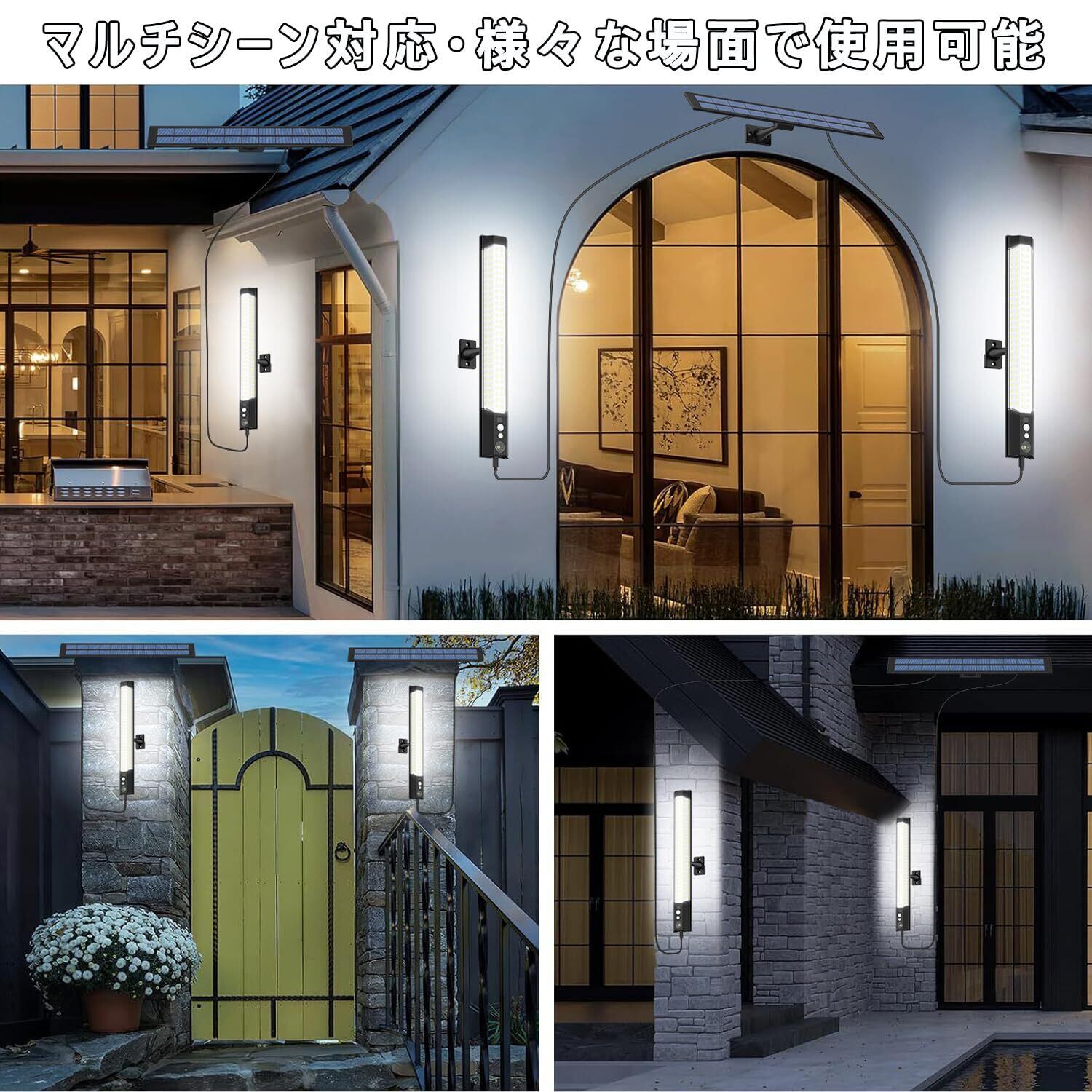 【使い勝手・取り付けが簡単】簡単な取り付ける方:付属のネジを使用して、配線なしで壁にソーラーライトを簡単に取り付けることができます。理想的な取付高さは1.8〜3 mです。(パッケージ内容:本体3面発光ライト*2/ソーラーパネル*1/リモコン*1/3mケーブル*2/ネジ*8)。「ご注意」①ソーラーパネルを8時間以上日光にさらし、十分な充電ができるようにしてください。②リモコンんを使用する時スイッチを確認して、「ON」になっていることを確認してください。③この製品は、充電中および完全に暗くない場所では人感センサーライトが作動しないです。④常時点灯モードで人感センサーが機能しません。⑤ソーラーライトは、雨水の浸入を防ぎ寿命を延ばすため、軒下や雨よけのある場所に設置することをお勧めします。製品に初期不良、破損などがございましたら、お気軽にお問い合わせください。24時間以内に対応させて頂きます。ご安心ください。
