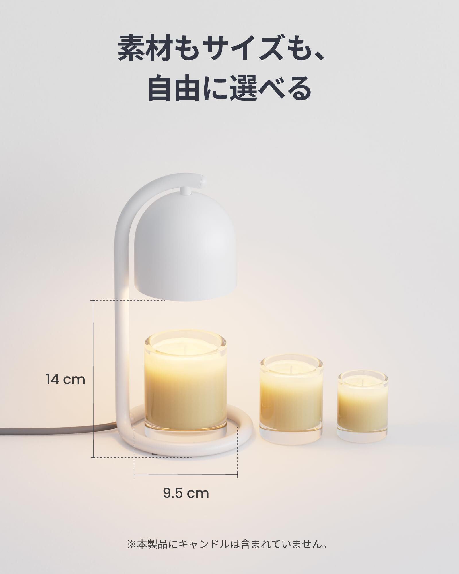 【素材もサイズも、自由に選べる】直径9.5cm、高さ14cmまでのキャンドルに対応。よく使うお気に入りも、季節ごとの香りも、そのまま置くだけ。自由な香りで、ととのう毎日を。アロマキャンドル・ソイキャンドル・蜜蝋キャンドルなど、さまざまなタイプに対応。お気に入りの香りを気軽に使い分けられます。