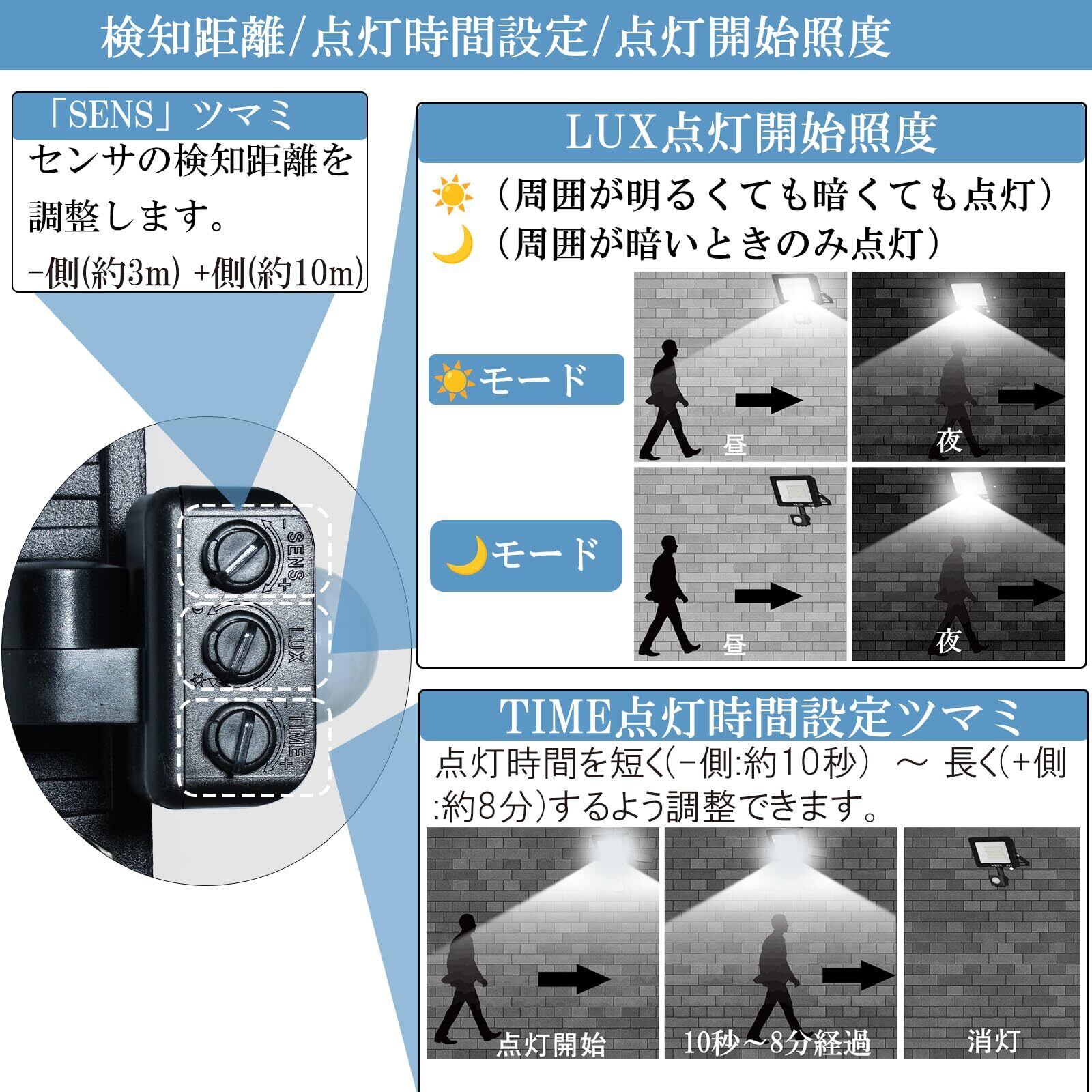 【点灯時間、検出距離、点灯照度の組み合わせをカスタマイズ可能】点灯時間、検出距離、点灯照度3つのモードが独立して設計され、相互に影響を与えないなので、様々な使用シーンに合わせてモードを調整でき、商品の取付は自由で便利です。【検出距離を調整可能】検出距離を調整することもできて、最大検出距離は10 mで、最小検出距離は3 mぐらいです。【点灯照度调整】️DAYモードは24時間動作し、NIGHTモードは夜間でしか反応しません。【TIME点灯時間設定ツマミ】点灯時間を短く(-側:約10秒) ~ 長く(+側:約8分)するよう調整できます。
