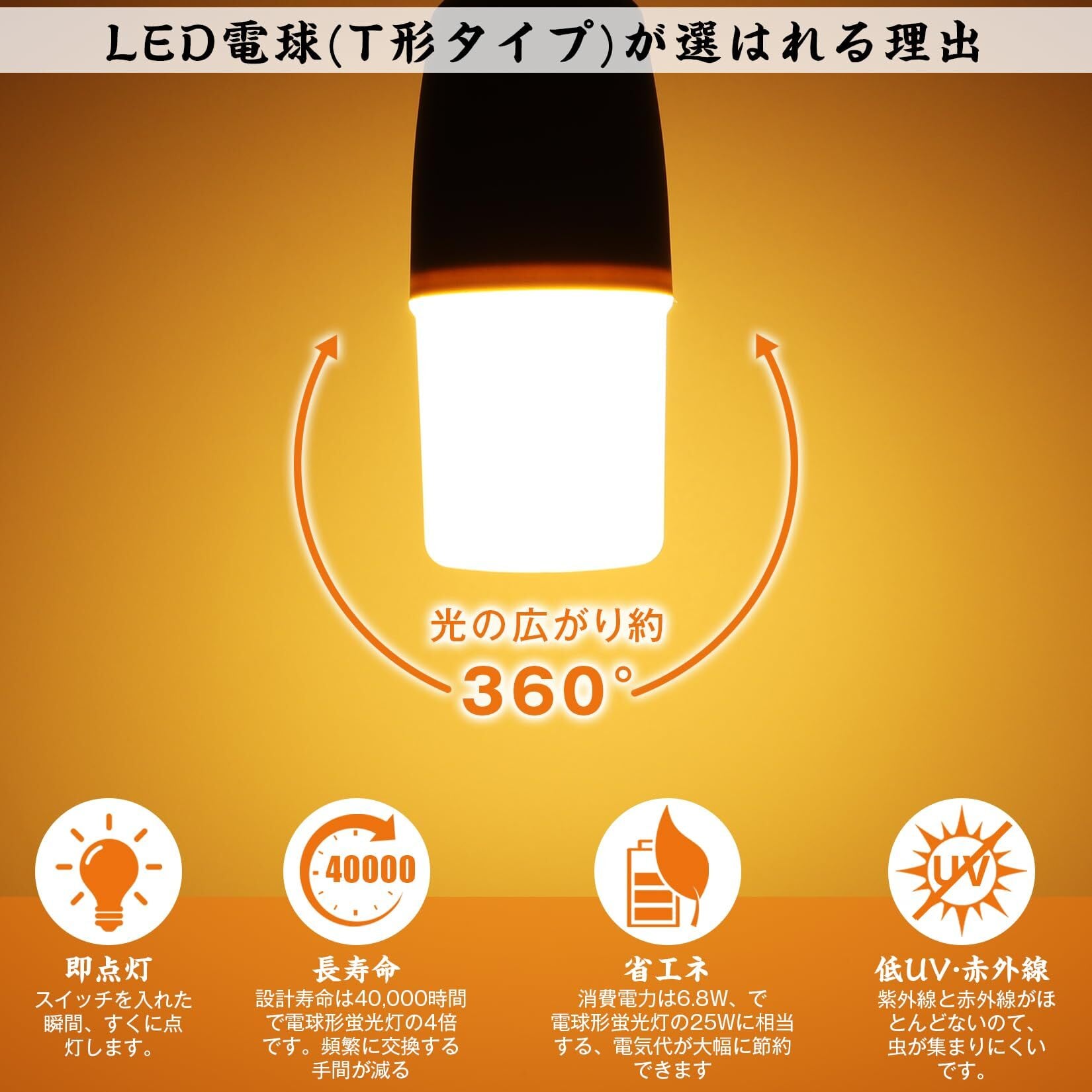 - 特徴:LED電球 T形タイプ、60W形相当、電球色