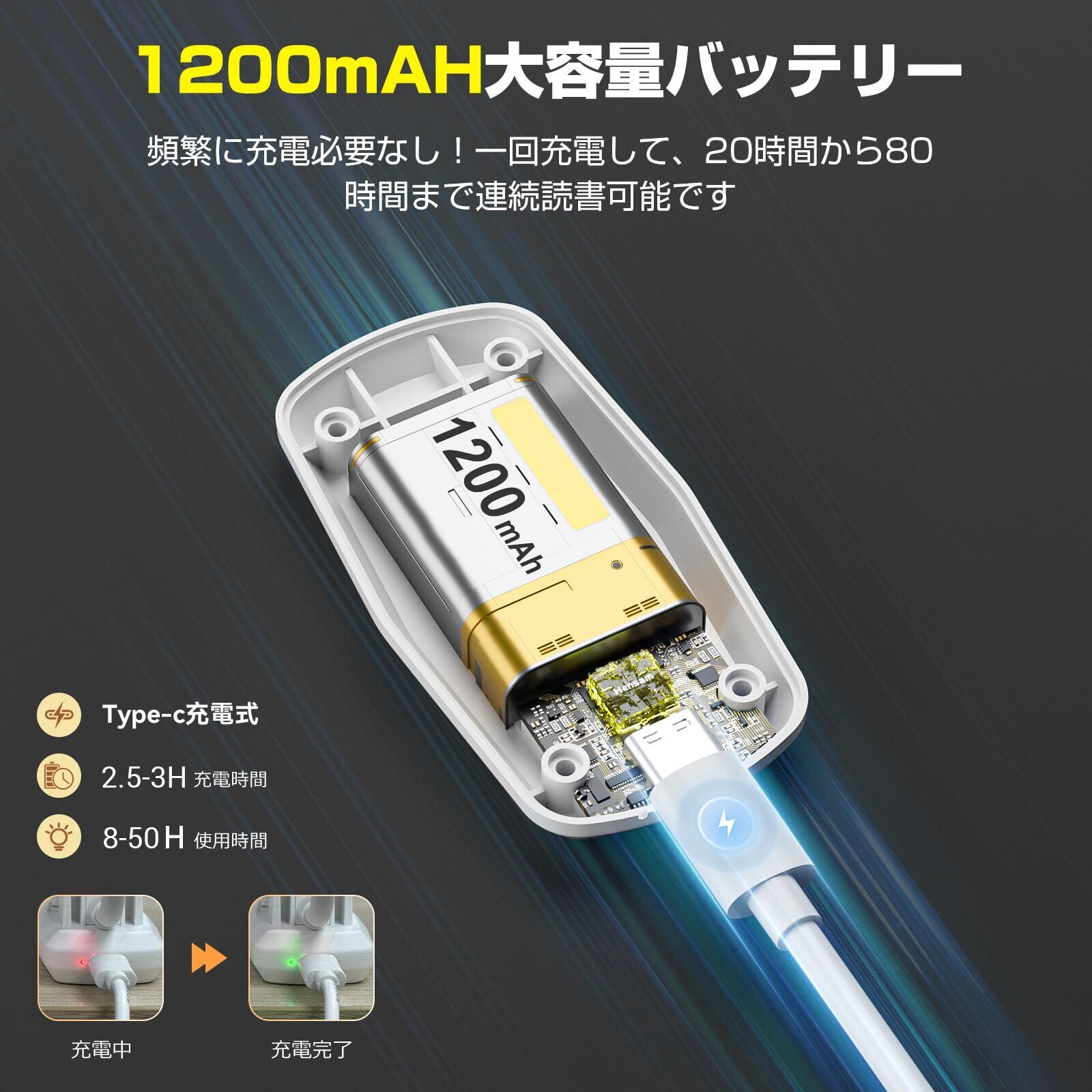 【1200mAH大容量バッテリー搭載】USB-C充電式のクリップライト、より速くよりセーフ。頻繁に充電必要なし!1回のフル充電で、20時間から80時間まで連続読書は可能です。(充電時間2-4H;クリップ作業サイズ:2.5cmまで)