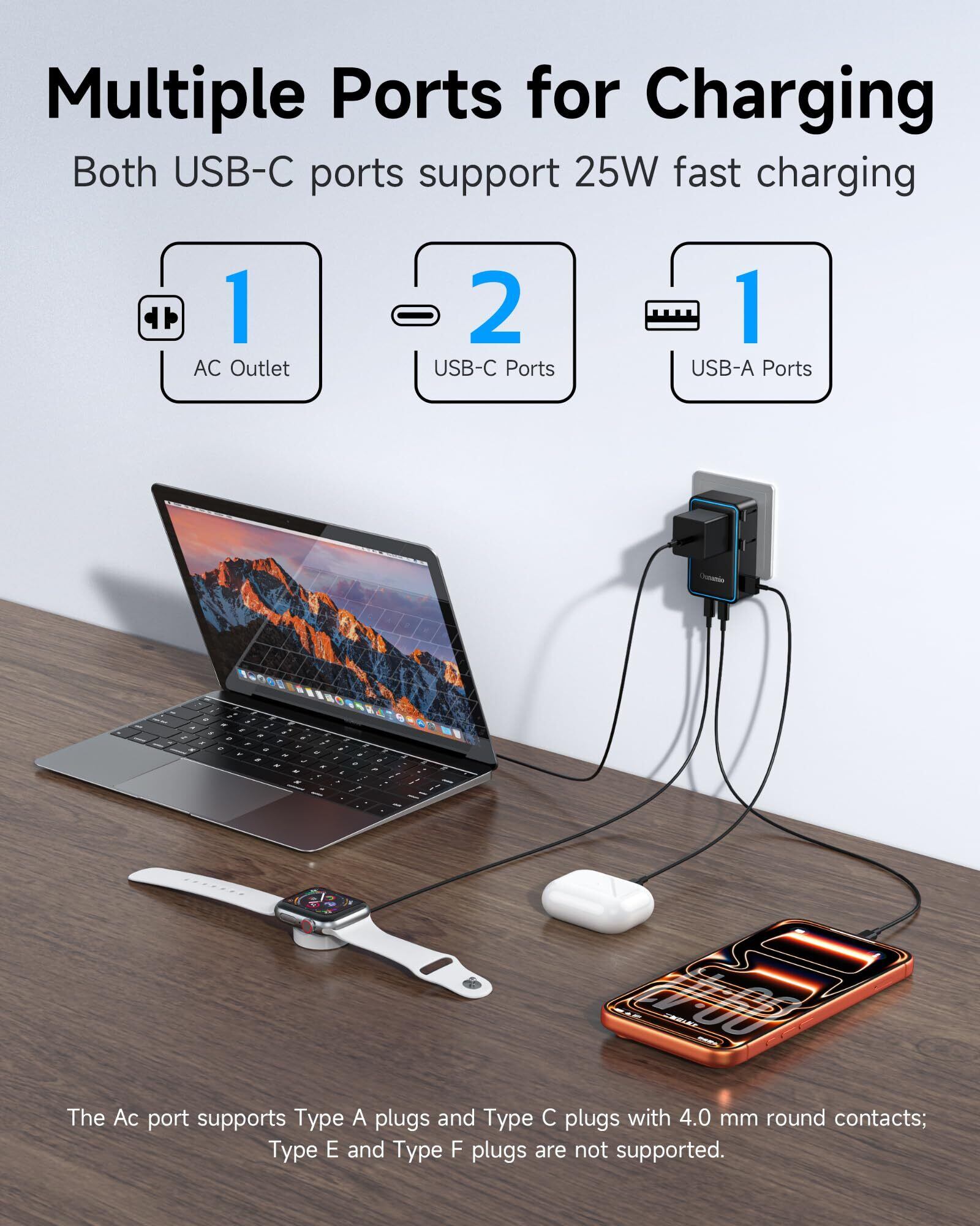 【スマート配分】25W PD & 4ポート同時 - USB-C×2(最大25W PD) 搭載で、iPhone 17を28分で50%。AI最適化技術で接続機器を自動検知し、効率的なを実現。ノートPC・スマホ・タブレットの同時駆動も安定。