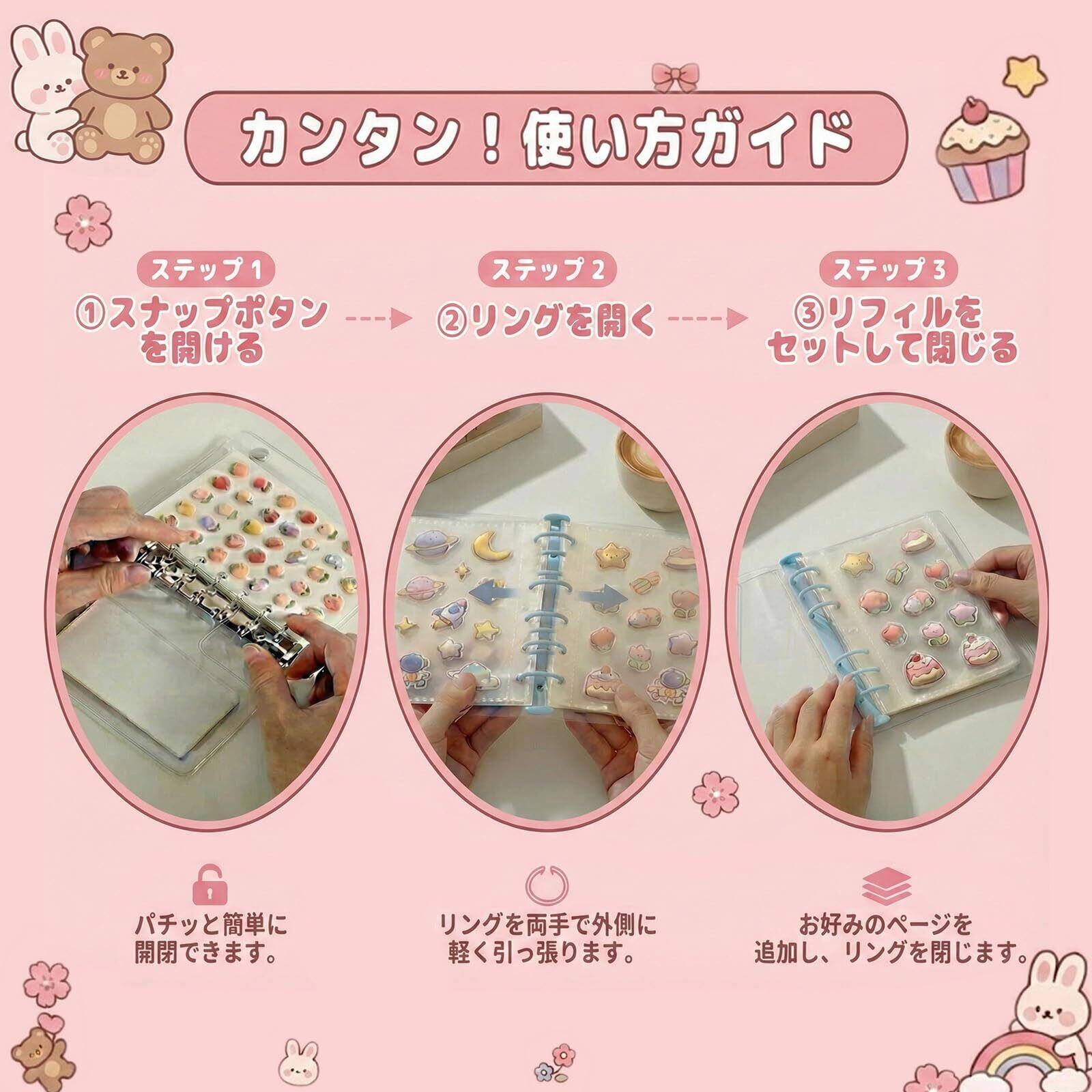 【透明リフィル10枚付きですぐ使える】透明リフィルが10枚付属しているので、届いたその日からシール帳ライフを始められます。