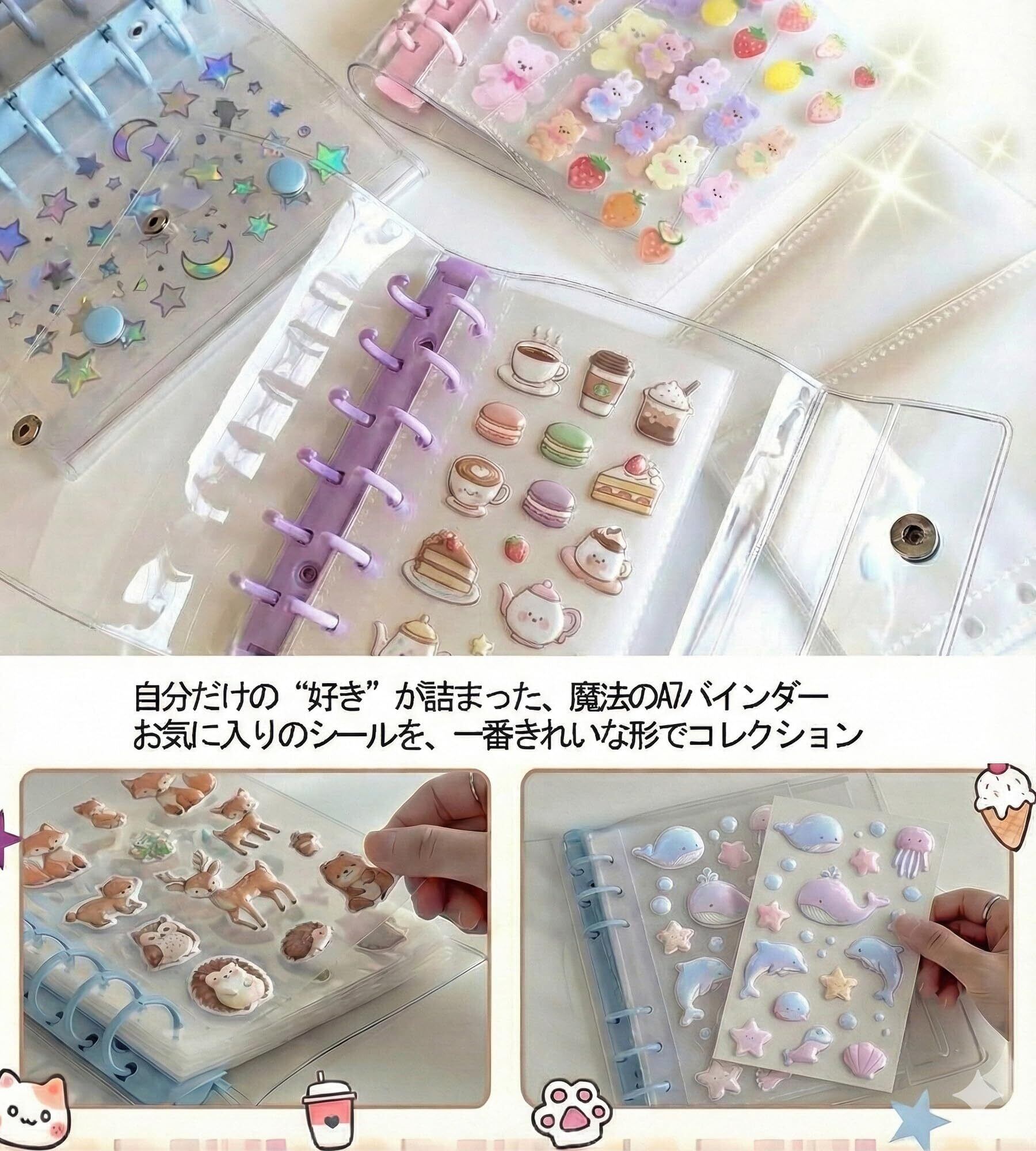 シール帳 クリア A7 女の子 はがせる 6穴 145x110mm 差替式ファイルポケット リフィル10枚 シール バインダー 透明 シール手帳 詰め替え シール収納 推し活グッズ(パープル)