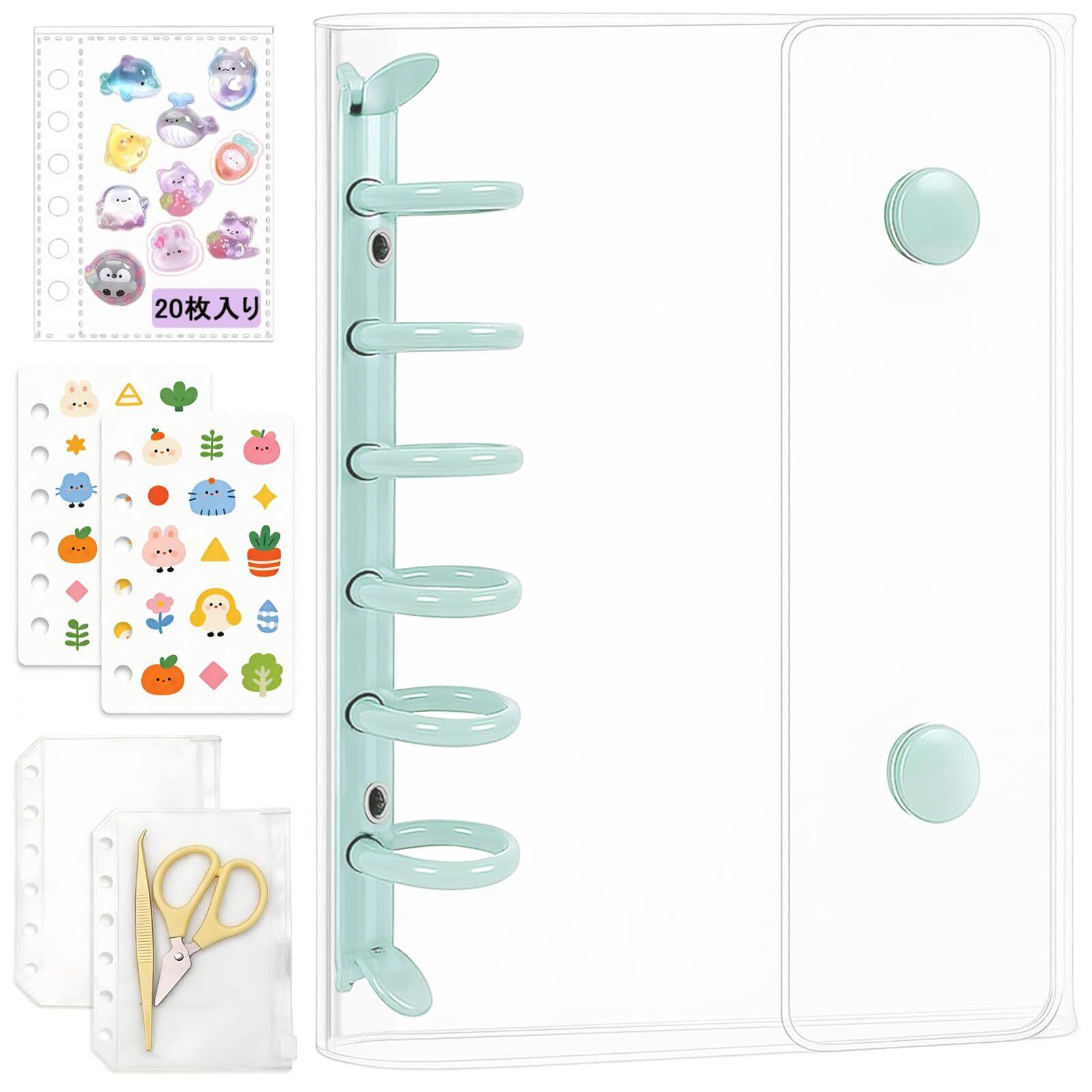 バインダー 透明 シール帳 A7サイズ【バインダー×1個+リフィル×20枚+下敷き×2枚+チャック付きポケット×2枚】 3層構造 カードスリーブ ミニシール帳 ミニ クリアバインダー A7かわいい シール収納 6穴 シールバインダー 女の子 推し活 文房具 メモ カード 写真整理 便利ファイル (ミントグリーン) (ミントグリーン)
