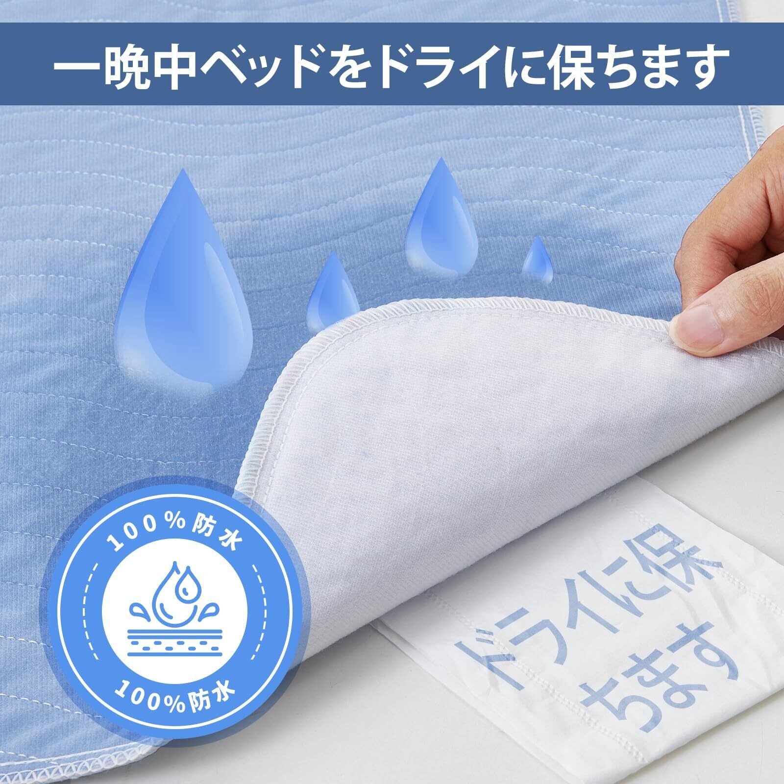 【強力吸水&完全防水】厚手多層構造で側漏れを完全ブロック:防水シーツは従来の薄い防水シーツの弱点を克服。表面は超吸水機能に優れた多層素材を採用し、水分を素早くキャッチして広がりを防ぎます。裏面には高密度TPU防水フィルムを採用し、完全防水を実現。寝具への浸水を防ぎ、洗濯物の負担を軽減します。