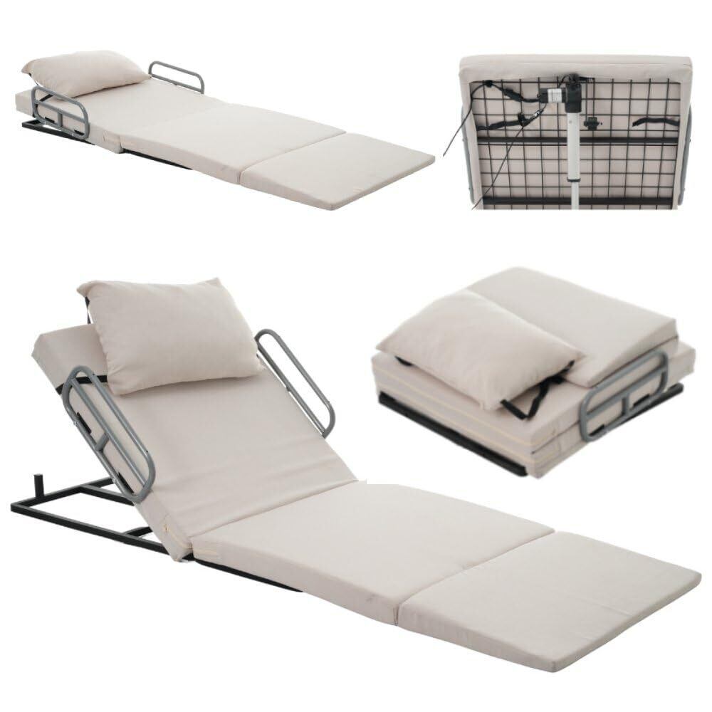 折りたたみベッド シングル 介護ベッド 電動 【リモコンボタン操作で角度調節・2°~70° | 腰部をサポートする曲線設計 | 配線整理デザイン | サイドレール | 枕固定可能 | 組み立て不要 | カバー取り外し&洗濯可能】 介護用品 簡易ベッド 折り畳み 室内 折り畳みベッド シングル ベット folding bed 休憩室 来客用 高齢 妊婦 産後 術後 ベージュ