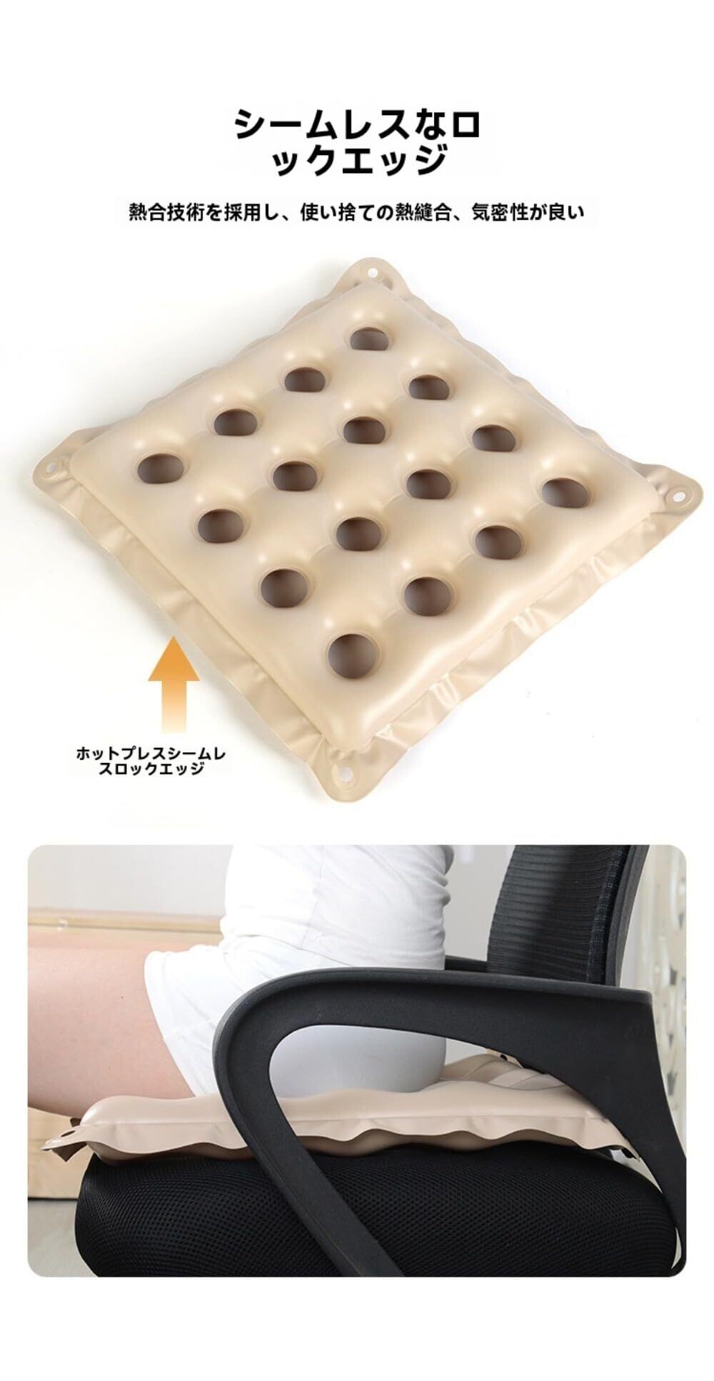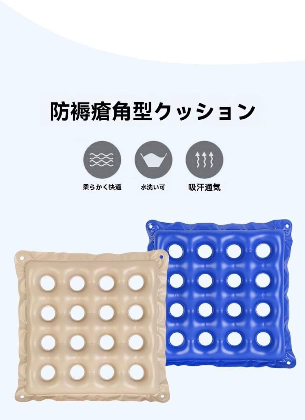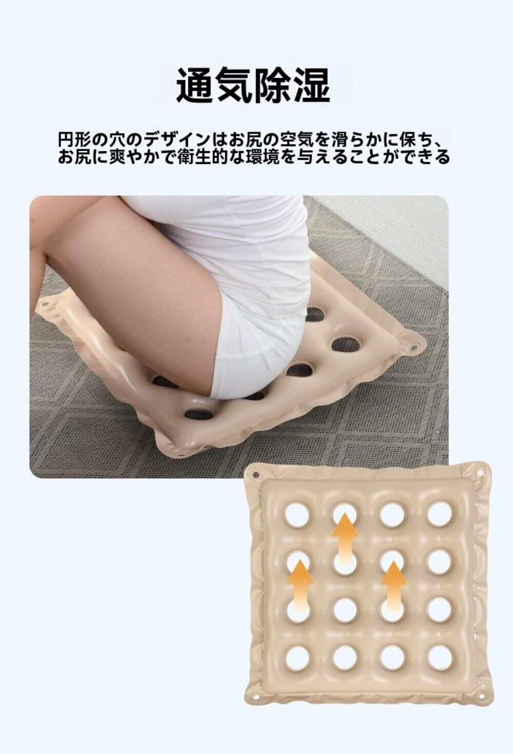 - 特徴:体圧分散、折りたたみ式、通気性、防水機能、滑り止め