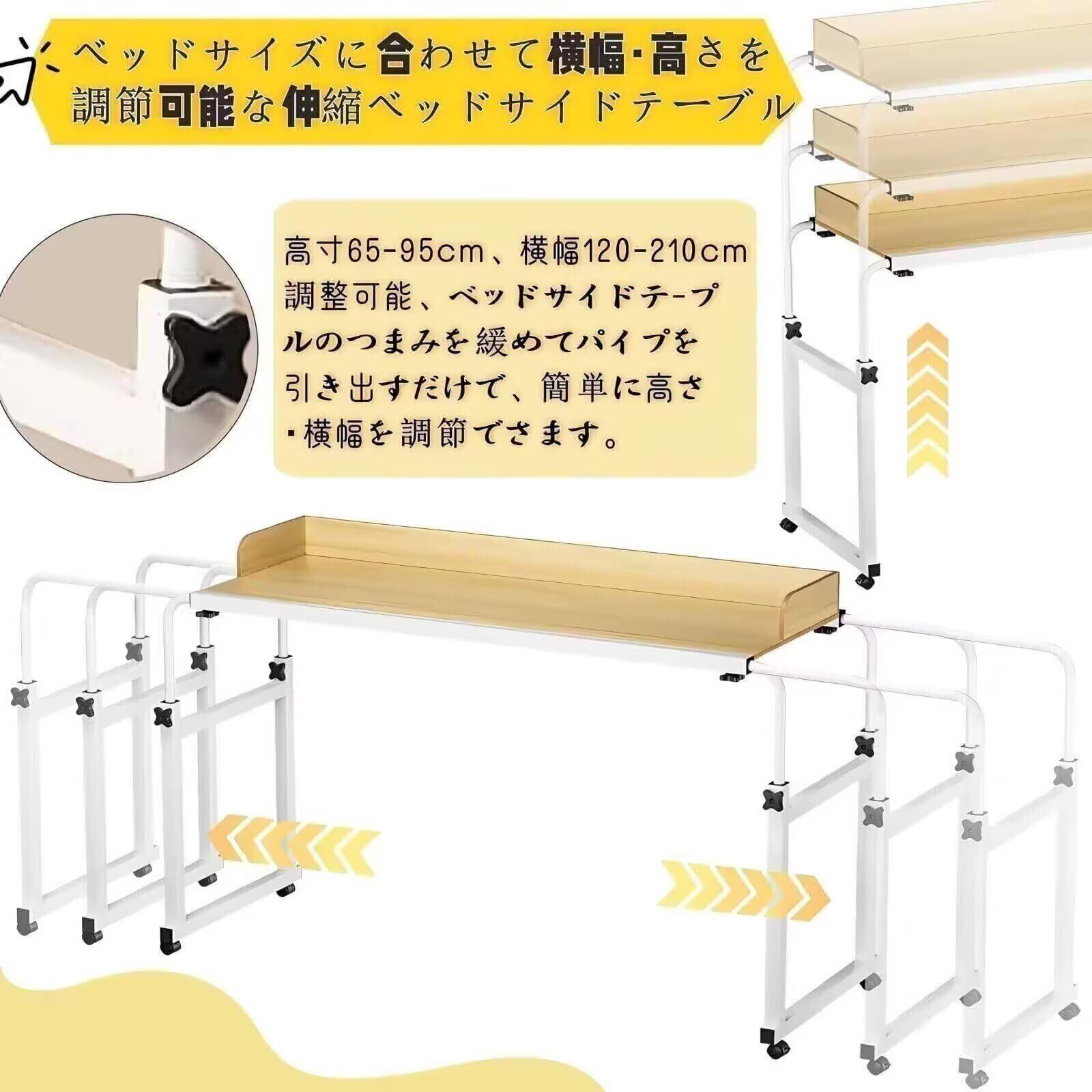 【調節可能ベッドテーブル】ベッドサイズに合わせて横幅・高さを調節可能な伸縮ベッドテーブル。高さ65-95cm、横幅120-210cm調節可能、ベッドサイドテーブルのつまみを緩めてパイプを引き出すだけで、簡単に高さ・横幅を調節できます。 「ご注意:サイズ測定では1-3cmの誤差があります。予めご了承ください。」