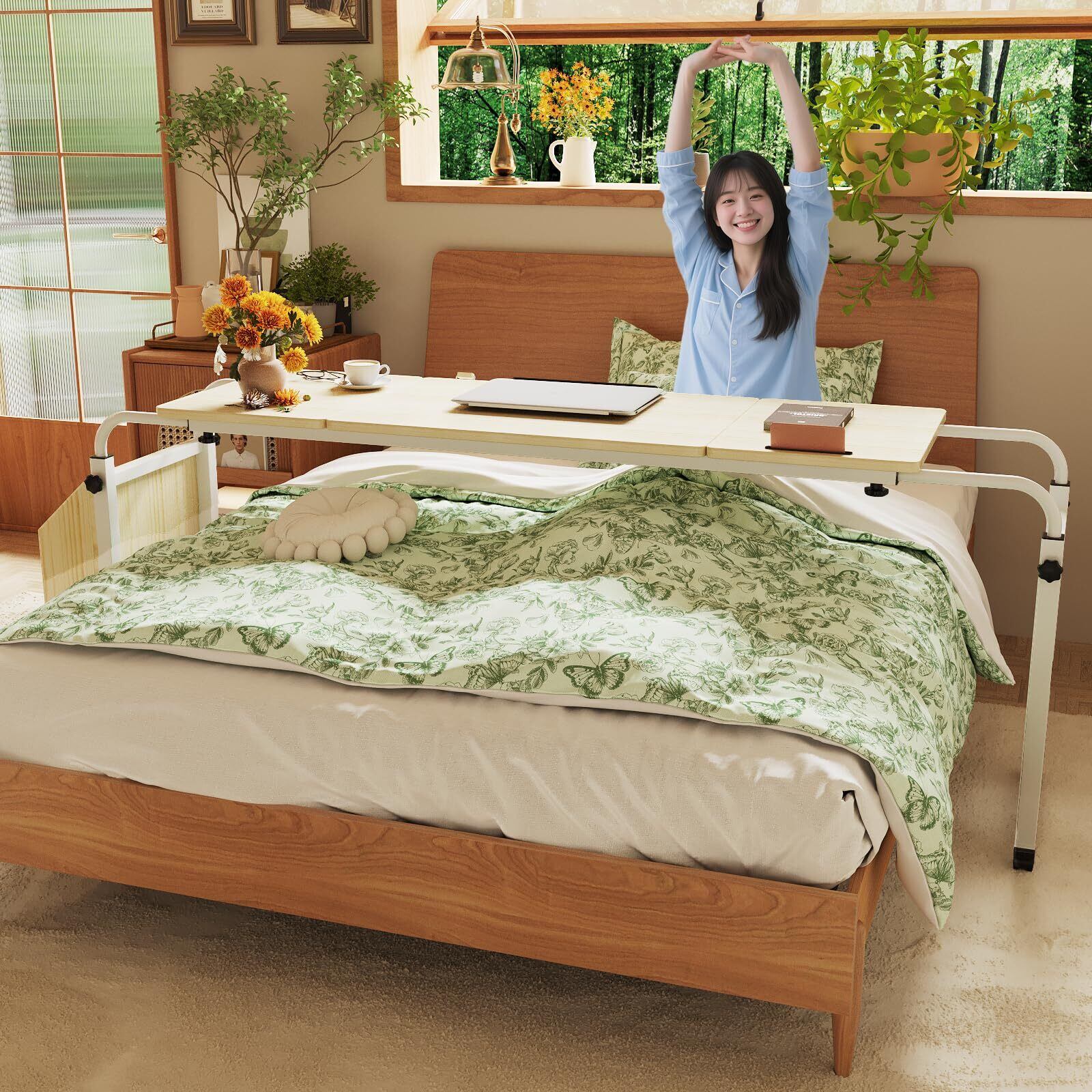 ベッドテーブル サイドテーブル キャスター付き 伸縮可能 高さ調節可能 横幅120-170cm 高さ60-90cm おしゃれ 昇降サイドテーブル ソファサイド カフェテーブル フェンス 落とし防止高バッフル付き 耐荷重50kg 耐水耐磨耗 学生ダラダラ族向け寝室用机 (ホワイト)