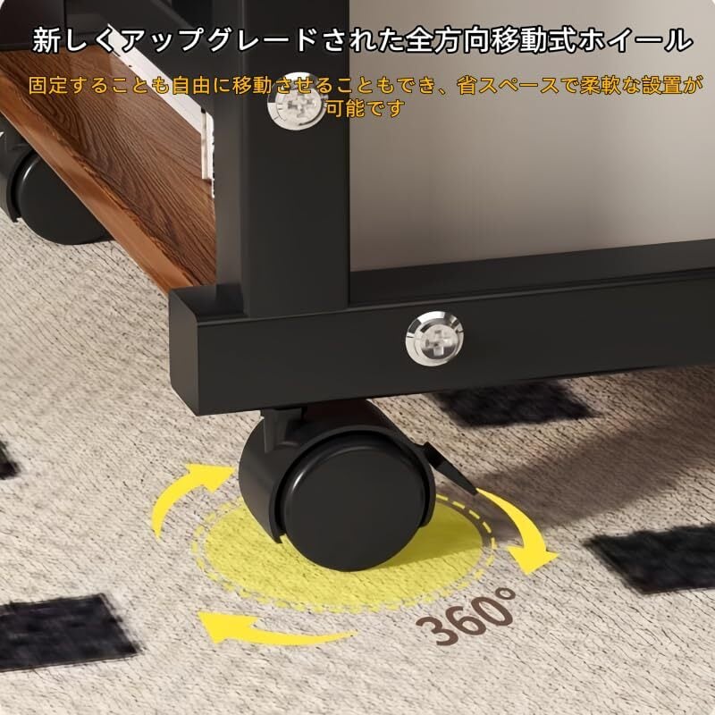 2. 【移動ラクラク&しっかり固定のキャスター付き】 4つのキャスター付きで、ご高齢の方でも軽やかに移動が可能。必要な場所へサッと動かせます。また、ホイールロック機能で、使用時はテーブルをしっかりと所定の位置に固定。ぶれたりずれたりしない安定性で、パソコン作業や食事も安心してお楽しみいただけます。