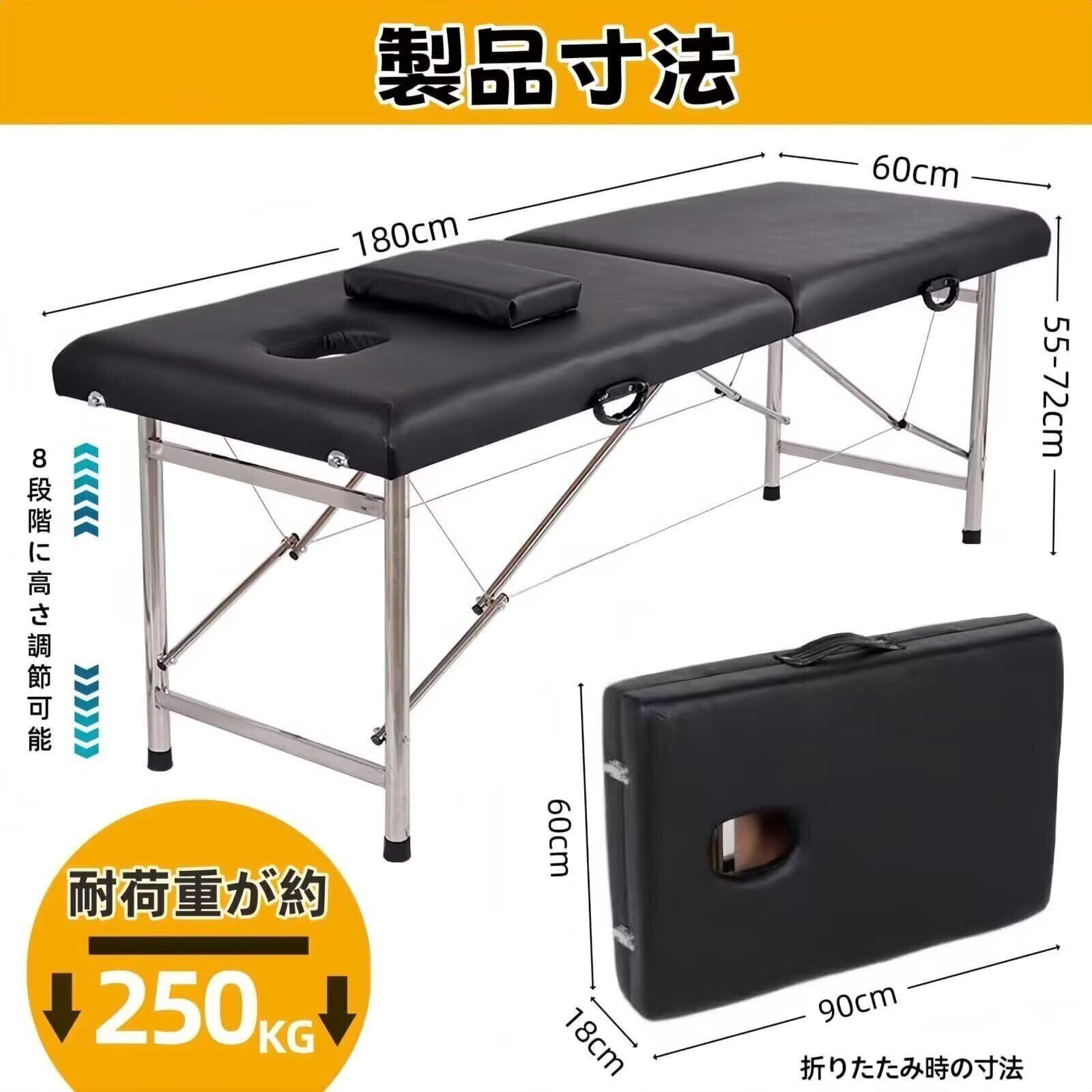 マッサージベッド 折りたたみ エステベッド 施術台 整体台 耐荷重250kg 長さ180×幅60.1×高さ50-72cm 8段階に調節可能 高密度スポンジ 快適 軽量 ポータブル マッサージ台 完成品 組立不要 コンパクト収納 出張施術/在宅ケア/開業準備用(ブラック)