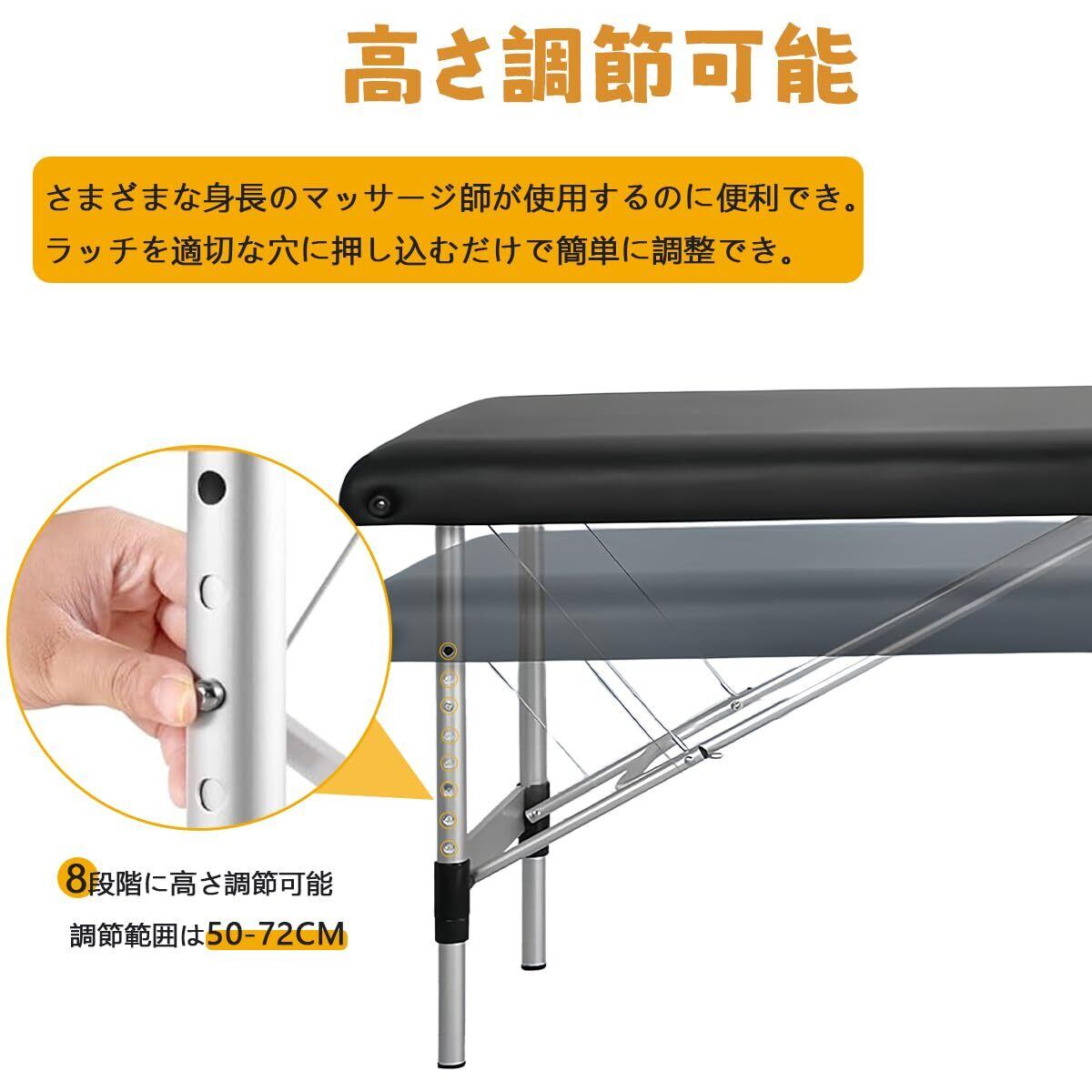 【8段階に高さ調節可能】8段階の高さ調節が可能な施術ベッドは、調節範囲は50-72CMで、さまざまな身長のマッサージ師が使用するのに便利でき。ラッチを適切な穴に押し込むだけで簡単に調整でき。一人ひとりに最適なリラクゼーションを提供します。