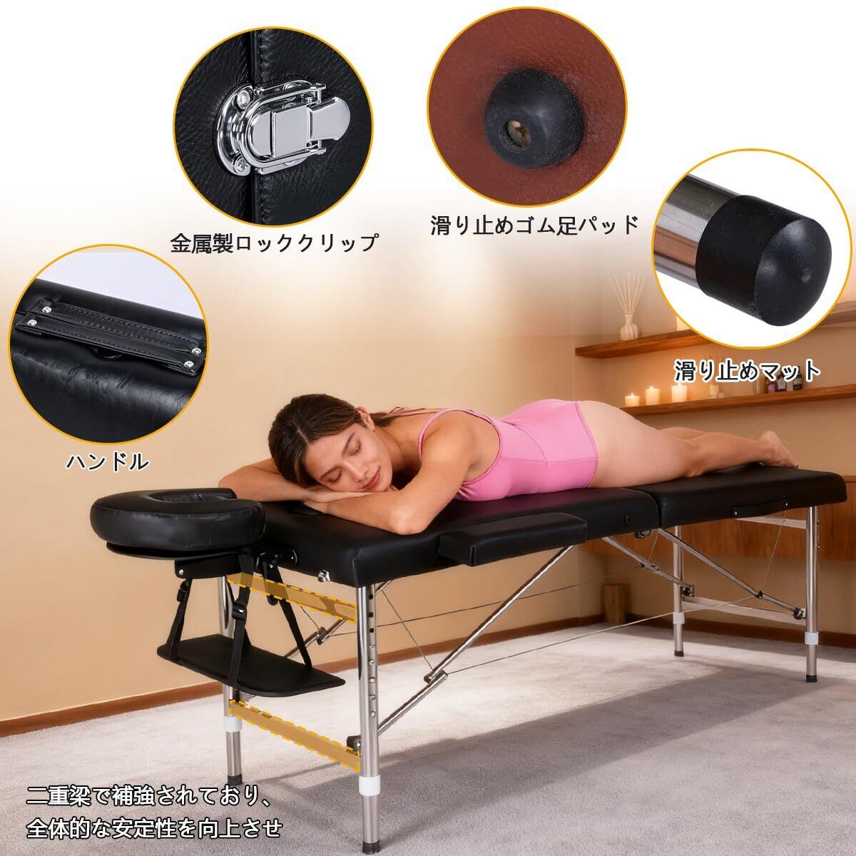 5【コンパクトに収納可能!】使用しない時は折りたたんでコンパクトに収納できます。省スペース設計なので、自宅やサロンでの使用にも最適です。出張施術や家庭での使用にも役立ちます。