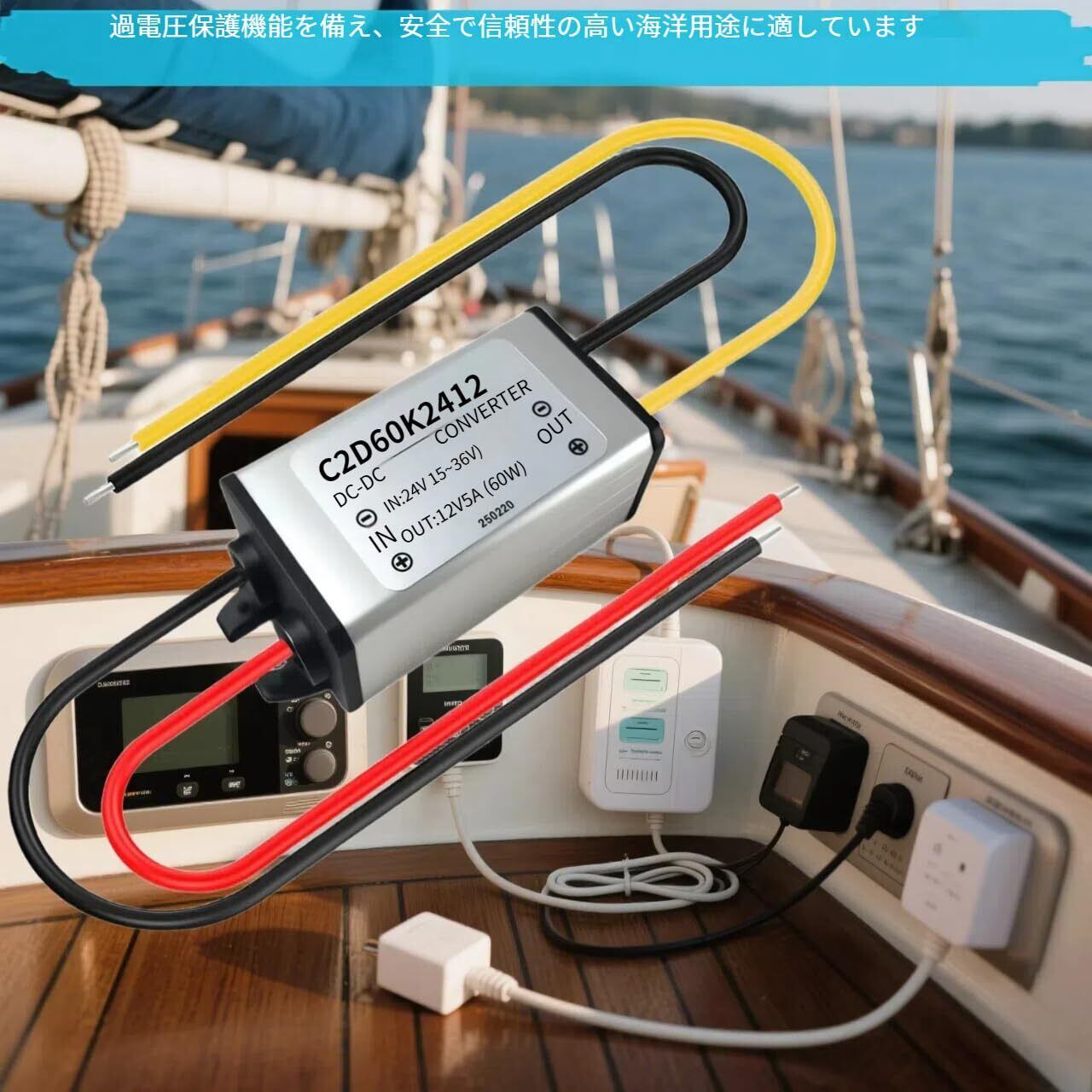 1【高効率な電圧変換を実現!】この「DC 24Vから12V 5A防水DC-DCコンバーター」は、DC24VからDC12Vへの変換を行い、最大出力60Wで様々な電動機器に安定した電力を供給します。トラックやSUV、船舶などの使用に最適な設計です!