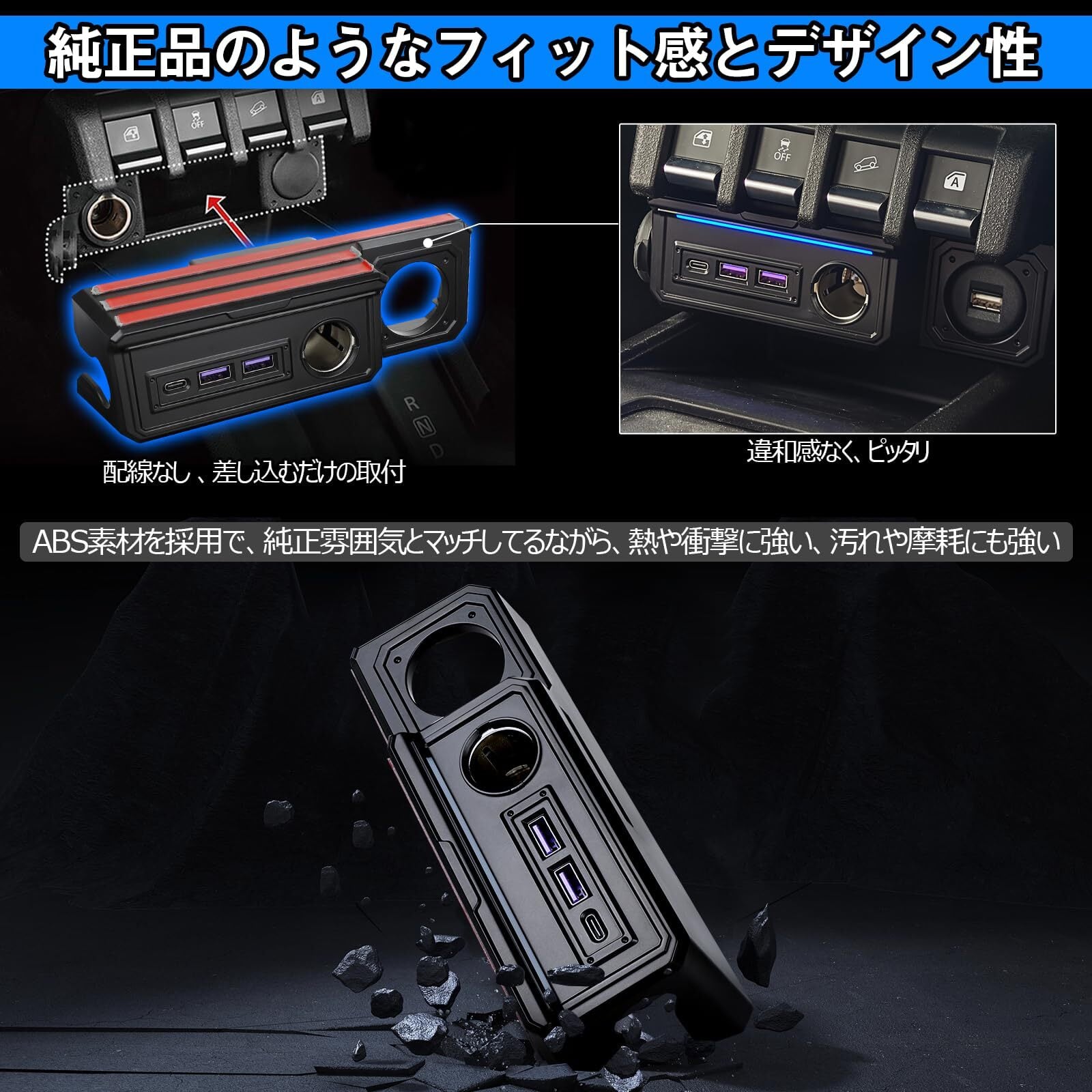 スズキ ジムニー 専用増設電源ユニット、適合車種:ジムニー JB64W/ジムニーシエラ JB74W/ジムニーノマド JC74W ※右ハンドル車専用。製品仕様:QC3.0 USB ポート×2、Type-C PD ポート×1、シガーソケット×1、LEDイルミネーション付き。セット内容:電源ユニット本体×1、固定用両面テープ付き、ウェットティッシュ付き、1年保 証付き。取付位置:センターコンソールのシガー電源に取付。