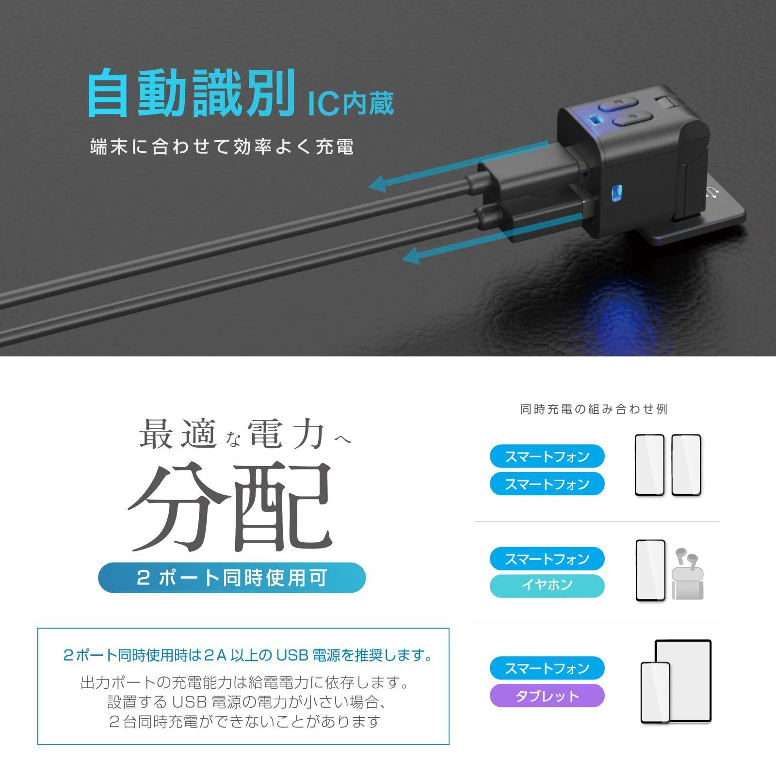 USBポートA×1を、A×1+C×1の合計2 ポートへ増設。充電専用 / 端末に合わせて最適な電力へ分配する自動識別IC搭載