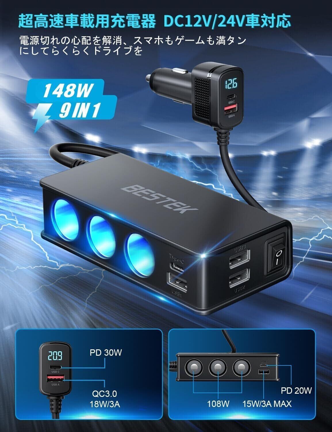 1【車内での充電がもっとスムーズに!】この「BESTEK 車載充電器」は、12V/24Vシステムに対応し、3つのUSBポートを搭載しています。QC3.0およびPD30W急速充電に対応しているため、スマートフォンやタブレットを短時間で充電可能です。移動中もストレスなくデバイスを活用できます!