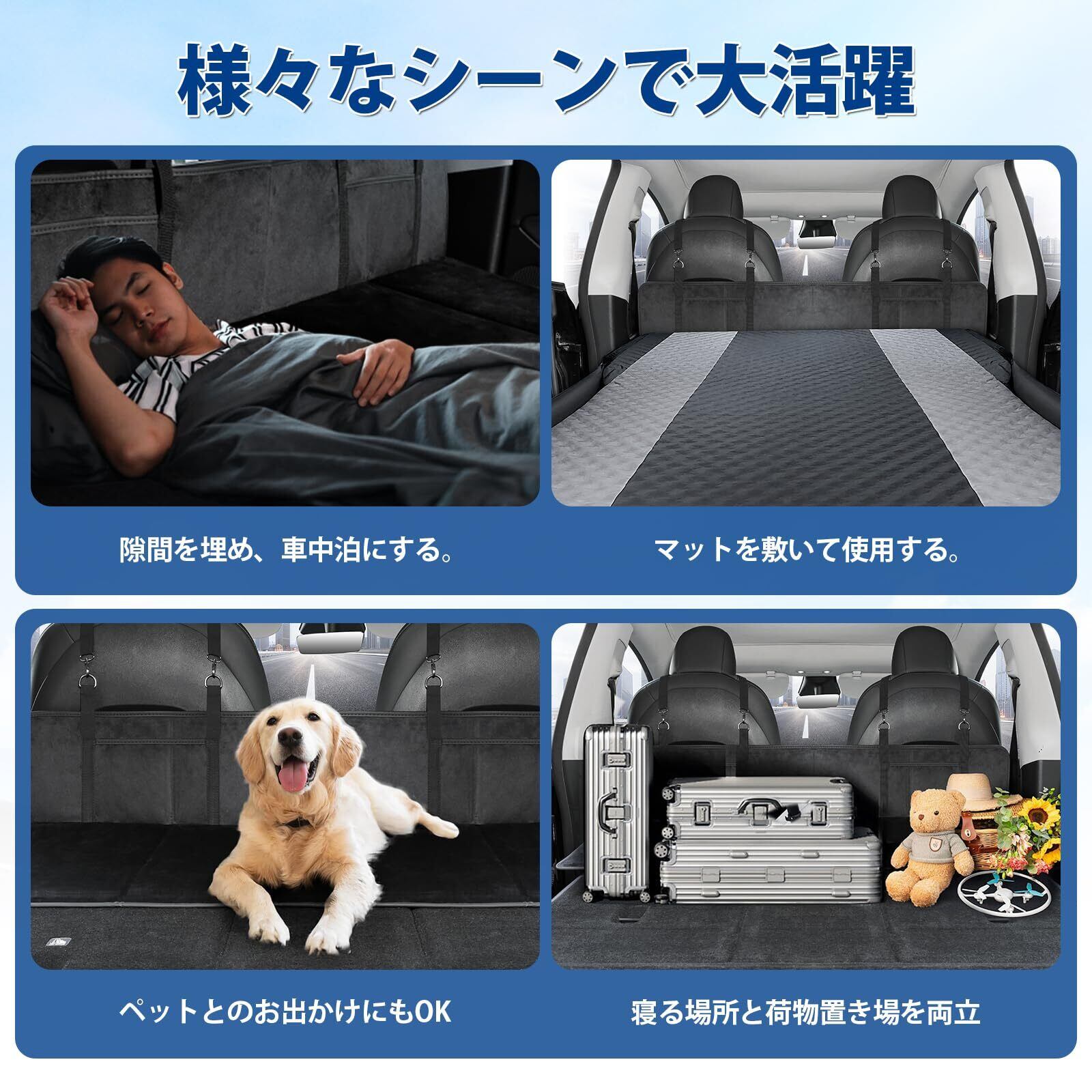5.【様々なシーンで活躍】キャンプ、ビーチ、車中泊、長距離ドライブなど様々なシーンで活躍しています。いつでもどこでも快適な睡眠が取れます。軽自動車、セダン、SUVなどほとんどの車に対応可能です。※ご購入前、必ずお車のサイズをご確認ください。