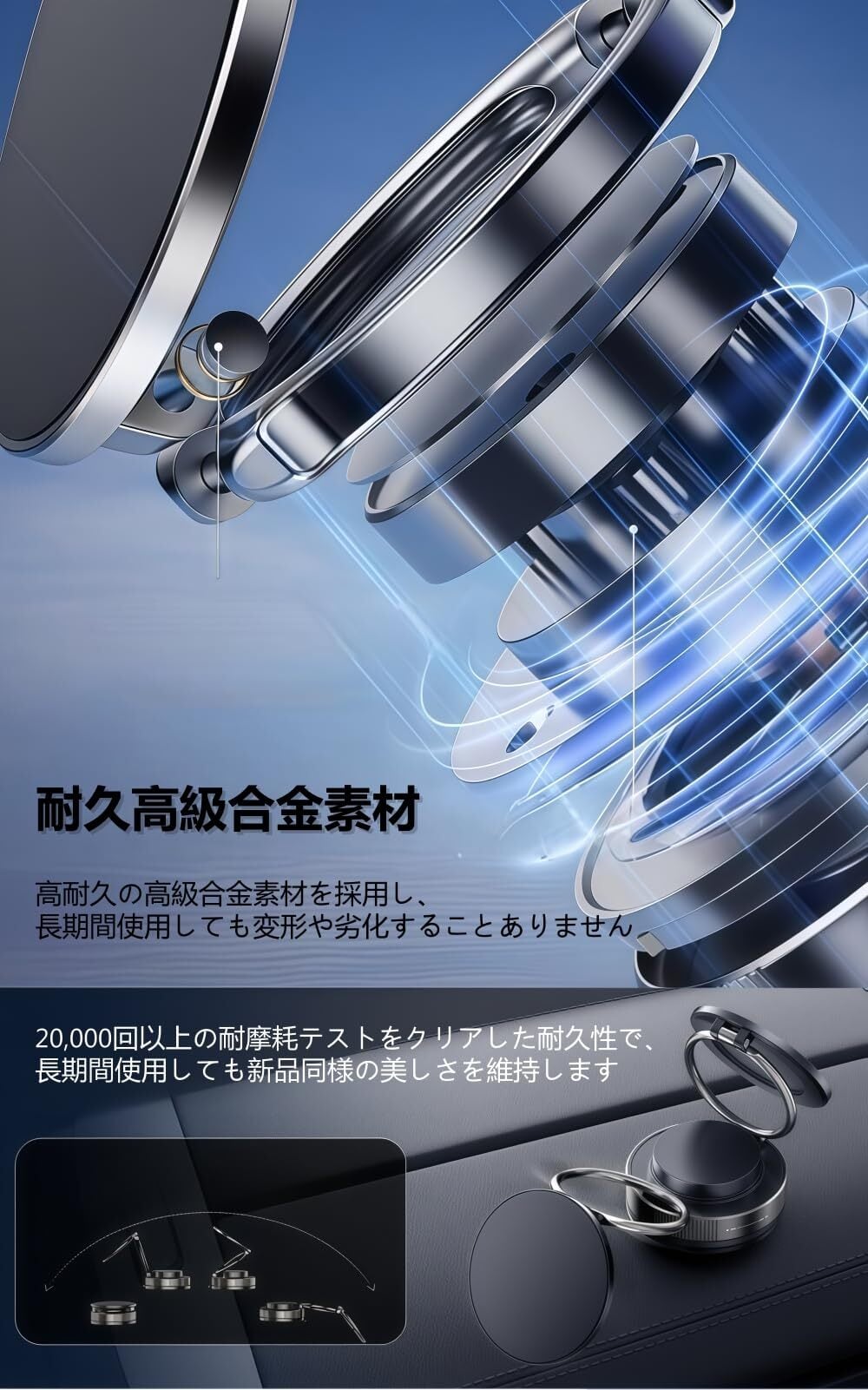 【最高品質、信頼の一品】弊社の車 スマホホルダーは、安価なプラスチック製品とは異なり、航空アルミ合金素材を採用した軸体で、20000回以上の折り曲げテストをクリア。スムーズな調整と高い耐久性を兼ね備えています。マグネット吸着部には職人技による繊細な表面加工を施し、ブルーLEDライト、確かな実用性と洗練された高級感を両立。父の日のプレゼントにもおすすめです!吸盤直径:7.2cm ケースの背面にマグネットリングを固定し、6時間放置して確実に接着してからご使用ください。弊社は年中無休、24時間対応のサポート体制を完備し、いつでもお客様をサポートいたします。 お客様の満足が弊社の最優先事項です。