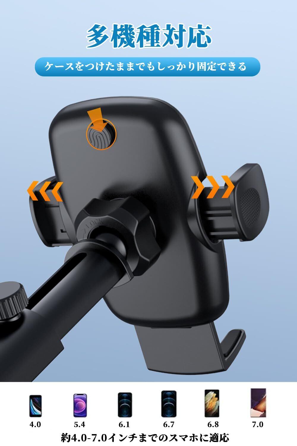 3【伸縮アームで抜群の安定感!】伸縮アームを採用しており、あなたの視線に合わせて高さや距離を調整できます。運転中の振動や揺れにも強く、スマートフォンをしっかりと固定してくれるため、安心して利用できます。